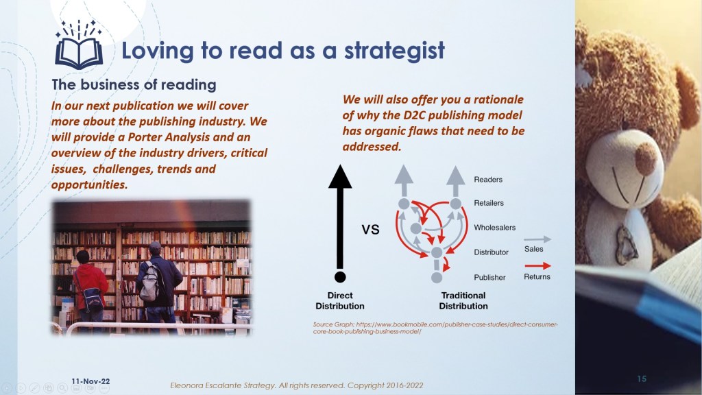 The book publishing business model. Slide number 13, illustrates the business model of a typical publishing company. I will discuss this in our next session because I need to review some details about the book publishing value chain. I don´t have all the reliable data on my hands, so I am doing miracles to make sense of what I can obtain from public sources on the Internet. A market research study from this industry costs around $4,000 to $6,000 dollars, and I can´t afford it. So I have tried to do my best with what I can, by identifying the truth from the faux. Today, we only wanted to show you a prelude to what is coming next week. In our next publication, we will cover more about the publishing industry. We will provide a Porter Analysis and an overview of the industry drivers, critical issues, challenges, trends, and opportunities. We will also offer you an ample rationale about why the D2C publishing model has organic flaws that need to be addressed.