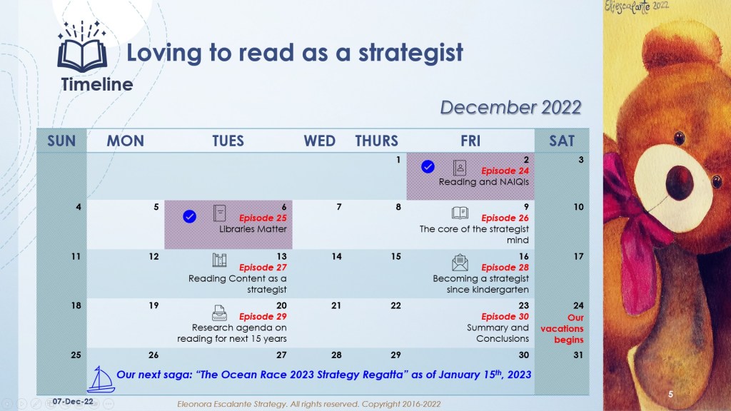 See you next Friday 9th of December with the 26th episode of the saga “Loving to read as a strategist: The core of the strategist mind”. Thank you for reading to me. Blessings.