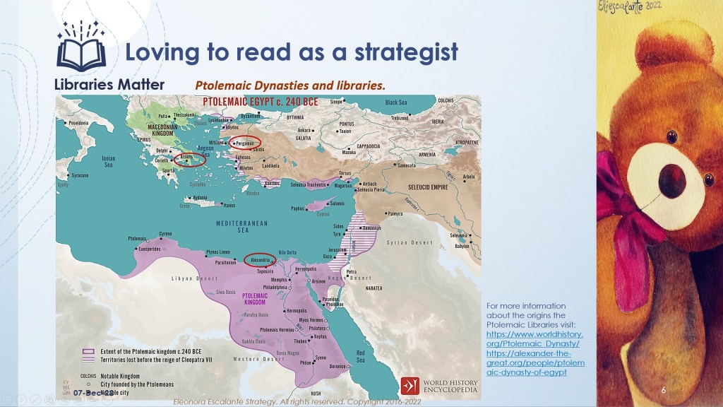 At that time, Aristotle was the role model of excellence to teach us how to organize his own collection of books, which it was the first of its kind in the old world. It was also the moment in time in which the regulation of books began. Greeks found out that books’ copies could be altered, and there was no quality control over the scribes who were copying the books. That is why the most erudite Greeks, took the crusade to recover the original versions of them. In their quest to guard the original version alive, the Ptolemies were blessed with a region that took Egypt and its resources; the world´s prime writing material (Papyrus). The Ptolemies took the lead to build Alexandria from scratch as the new cultural center for the region. Find the map of the Ptolemaic dynasties on slide 6.