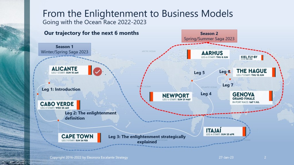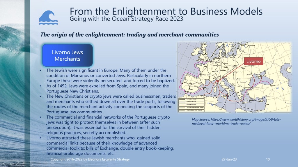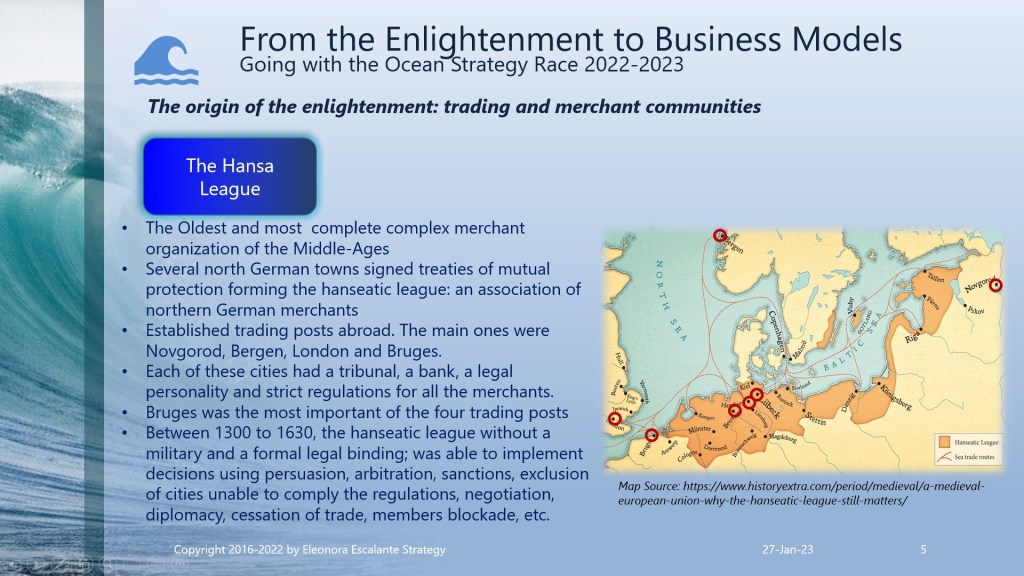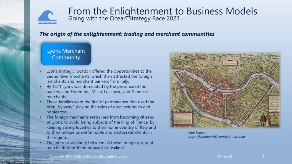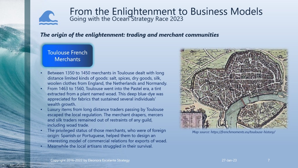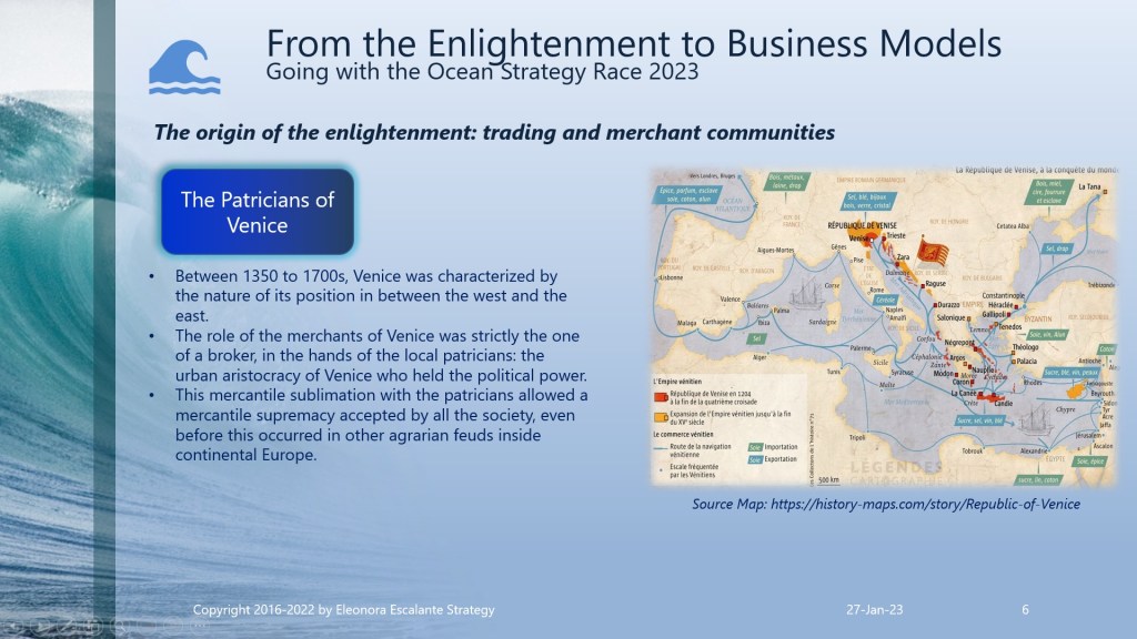 Eleonora Escalante Strategy hypothesis is by far beyond that. In our 2023 strategic management buzzword, we perceive without hesitation that it was a slow-motion shift of a mentality approach and the conventions of wealth creation and progress, or in our current vocabulary: how to do business modeling. It was a shift from the harvest as the heartbeat for subsistence to the origins of the merchant trading international economy. It was a swing from the “land” agrarian system (land cultivated by individual farmers, larger farms, and/or tenancies in the hands of powerful fewer peasants) to a merchant trading system. But with the accumulation of wealth in the hands of the new merchant economy players, a sense of dissatisfaction appeared: they didn´t wished the subordination to the rules of the kingdom monarchs of the city estates. As a result of these centuries of changes, the Enlightenment philosophers only arrived to try to put on paper and debate, how to authenticate those changes in the mindset of the souls who were playing a novel role in the fresh emerging incipient merchant system.