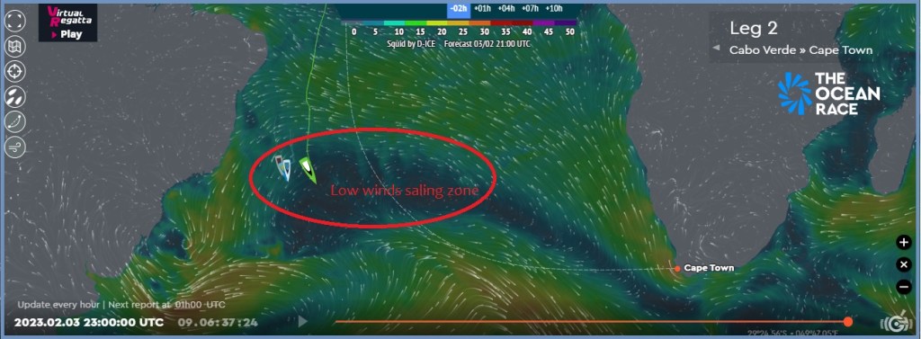 As I mentioned before, during the last 7 days, our sailors have been stuck in the Doldrums. Just a couple of days ago the Ocean Race teams were able to cross the Equator, and find better wind conditions. Nevertheless, at this specific moment in time, the clouds are also interrupting their plans. During the following days, the 5 teams will enter another “doldrums” region where there are no good wind conditions. Passing through the doldrums is worst than “hell” for any navigator that depends on the wind to advance forward. If you have been curious enough to follow Leg 2, the tracker of the Ocean Race 2022-2023 (click here https://www.theoceanrace.com/en/racing/tracker), shows a speed forecast of less than 3-5 knots. This means another 2 to 3 days of slow stagnation await us. By this moment of the race, we expect that you have been able to watch the dramatic changes in the wind speed of the IMOCA boats. These “have retractable foils that lift the hull out of the water above 18 knots (33 km/h) and allow a top speed of 35 knots (65 km/h) or more” (5). So when there is no wind, the boats are stuck. Zero motion unless gybing (zigzag).