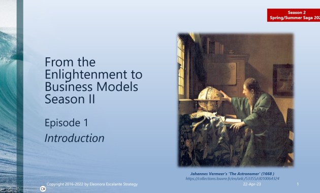 From the Enlightenment to Business Models. Season 2. Episode 0. Introduction A blessed primer.A blessed wunderkind to write again for you. Time passes by so quickly nowadays. Here we are returning from our relaxing vacation. To be honest I only feel […] eleonoraescalantestrategy 23 Apr 2023 Leave a Comment
