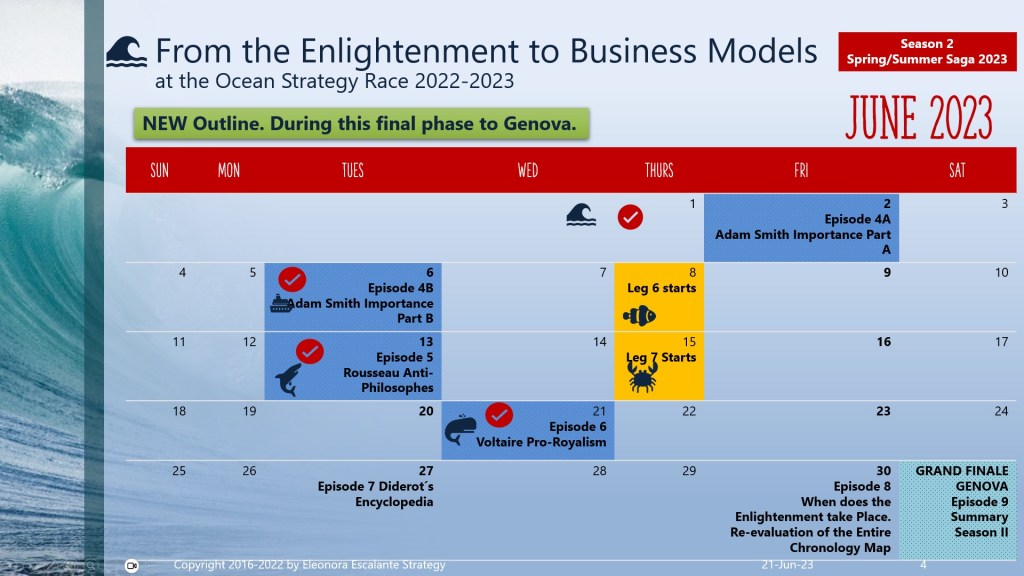 In season I, we prepared a condensed summary of Francois Marie d´Arouet, the real name of Voltaire. His resounding impact on the 18th-century movers and shakers of 6 European houses of rulers, wasn´t a coincidence. Voltaire had a scenic railway of ups and downs. Since his birth in Paris; his education in the Jesuit college of Louis-le-Grand; his innumerable voyages abroad in Europe; his option to become a writer of witty critical satires and tragedies; his hostility towards Christianism (particularly against the Catholic Church tied to the State and against Radical Protestantism); his two trips to the Bastille prison; his early triumphs in theatrical artworks which gained fame and recognition towards him; his immeasurable good luck by earning financial independence with the lottery; his scurry escapes from censorship and persecution; his forced expatriation to England; his lovers (Madame Du Chatelet, Madame Denis); his short period ascents to the French Royal Court; his nomination as a Royal Historiographer in 1745; his polemical publications of philosophy pro-Locke/Newton support in times of Descartes; his election to the French Academy, appointed as a “gentil-homme ordinaire de la chambre of Louis XV”; his decision to join the court of King Frederick II of Prussia for a few years in Potsdam and Berlin; his further quarrels with the Academy of Berlin; his diplomatic roles in the middle of the Seven Years War, including a spy job in favor of France; his connections with all the main Enlightenment Profiles of his era; his choice to purchase a couple of states in Geneva, his settlement in Ferney during the last 25 years of his life, and finally his continuum preparation, non-ending studies and production of ideas, which never ceased to taunt him during his 84 years span length. See slides 5 and 6.