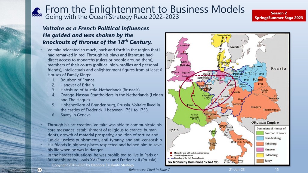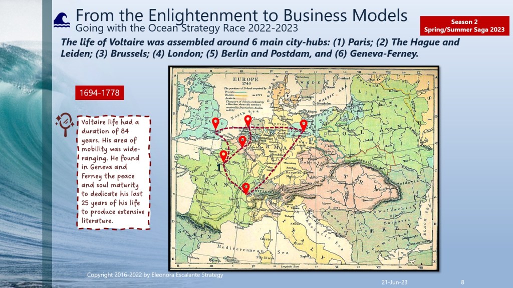 Through his travels, his fame, his expulsions from Paris, and his solid intellectual connections acquired since he studied at the Jesuit School of Paris, Voltaire was able to knit a rock-hard network of ties that allowed him to open doors with 6 houses of kings and its respective courts: the House of Bourbon in France, the Orange-Nassau Stadtholders in the Netherlands, the House of Habsburg of Austria-Netherlands (Brussels), the House of Hanover in Britain, the House of Hohenzollern in Prussia, and finally the Savoy’s from Geneva. His letters extended to Russia with Catherine II the Great, Gustave III of Sweden, and many others. I discovered this by linking the routes and mobility voyages of Voltaire during his 84 years of life (see slides 8 and 9, and 15).