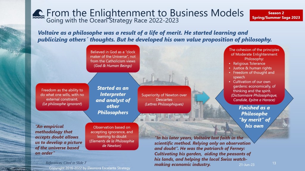 The recognition of Voltaire as a philosophe was a result of a life of dedication and merit. It wasn´t automatic. He started analyzing and diffusing the philosophy of other philosophers, and little by little, he took all his ethical messages which were immersed in his plays and literature, to create a cohesive value proposition of philosophy that can be summarized as you can read in slide 13: He used his literature as a tool to transmit the Moderate Enlightenment expression (see slide 13).
