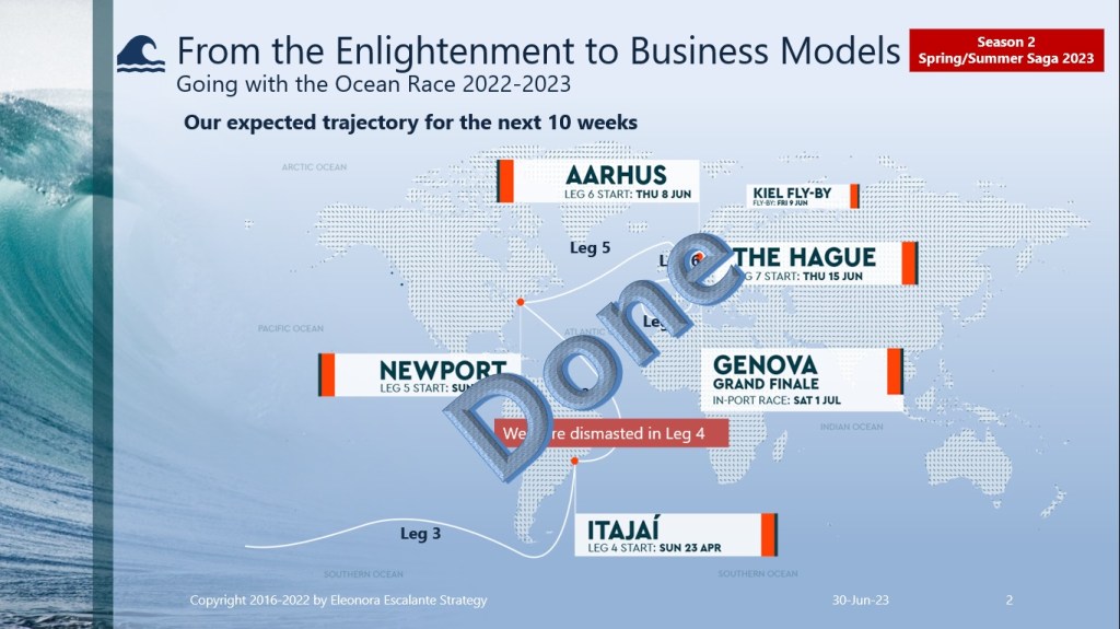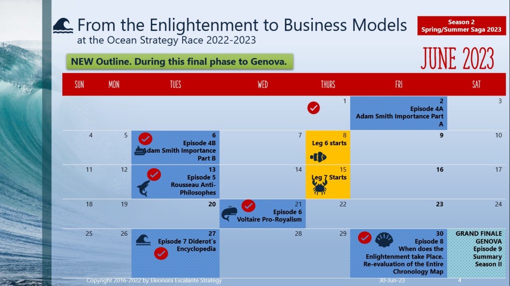 Congratulations and Gratitude. A thousand thanks. Felicitaciones to all the Ocean Race 2022-2023 fleet, who helped me to continue, after I was moved out from my former studio on May 1st. Thanks to the best historians from all over the world who have helped me since January 2023. I am grateful to the history and philosophy faculty professors from immense prestige universities, to the librarians, to Doctor Jonathan Israel, and all the authors of articles, journals, and such magnifique books that have helped me to understand the Enlightenment in an integral manner. Thanks to my friends and acquaintances, who have had the patience to read my emails when I was worrying in despair. Finally, thanks to my family who have sustained me since 2016 when I started Eleonora Escalante Strategy.