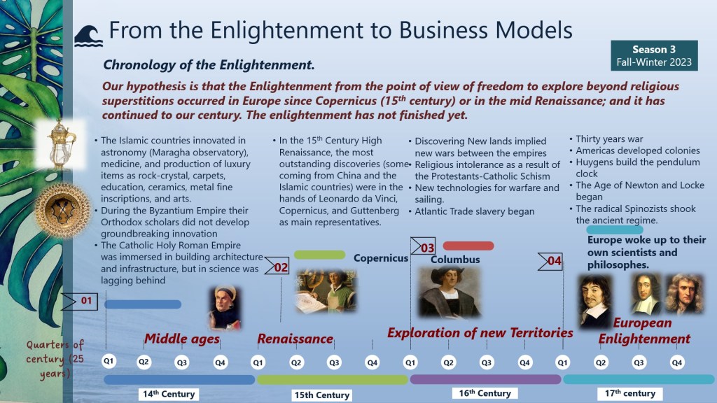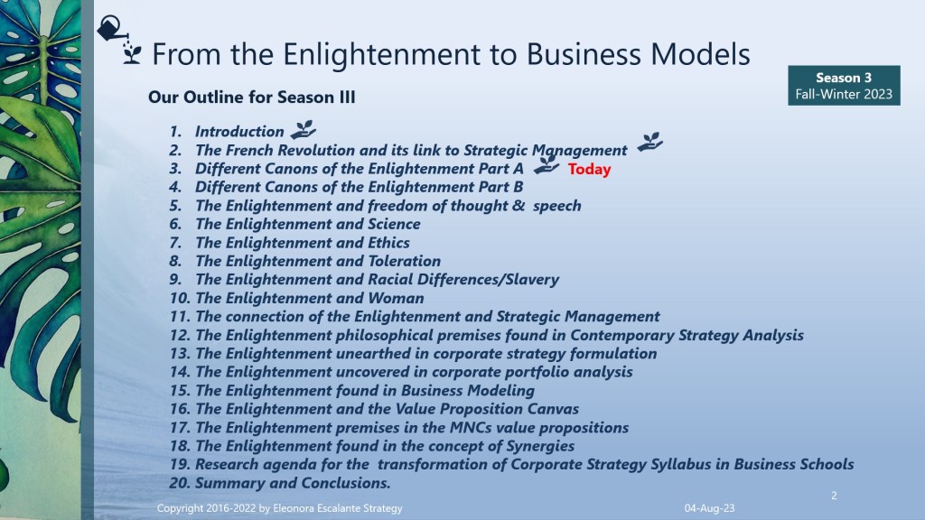Have you started to understand why we need to study our history with the most careful reckoning? Can you perceive why do we need to comprehend the roots of our business theories? Would you mind catching us, and grasping the true importance of this saga? All we are and do is interconnected with our past. And even if I could travel to Voltaire or Kant or Rousseau´s epoch, what I can share with you is just a little percentage of the truth, because I don´t hold all the bits and pieces of our past. All I am stating is that: Our businesses, our corporate strategy theories, and value propositions are linked to the Enlightenment. And we will try to uncover it during the next 18 weeks.