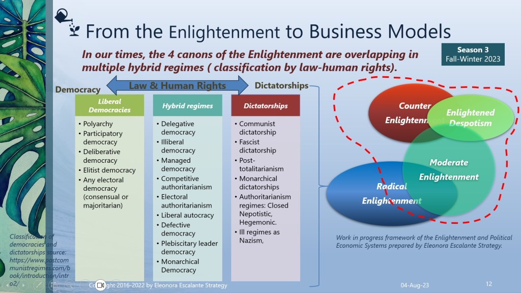 The philosophical views of each of these quartet of canons have not disappeared in the 21st century. It has evolved and changed over and over again. The philosophical background of each canon has changed a brand name or a name tag. It has used different make-ups. It has been perpetuated from clandestine status (underground) to open exposure (wide visible uprated) with certain modifications. Sometimes it has operated a mysterious mask using veiled organizations such as the Freemasonry, Rosicrucian, Illuminati, or even the Deutsche Union; and simultaneously it is clearly detected in several Christian denominations with roots in the 17th and 18th century that do not cherish the Catholic church. Nowadays, it is funny, but even some Catholic rituals and catholic denominations express one or more of the 4 canons of the Enlightenment. Every single entity that you can name in this world has elements of these canons. Nations, multinational corporations, religious organizations, and international cooperation agencies respond to several elements of these canons. In the case of countries, in our current times, it is hard to find pure canons, but hybrid regimes. No matter if a hybrid of a Totalitarian state or a Representative Democracy, a State-Monarchy, or a Dictatorship, all of them can be positioned in this graph. The quartet of Enlightenment canons can be measured and monitored through its economic systems, which hold industrial policies and businesses’ ways of doing trade all over our nations.