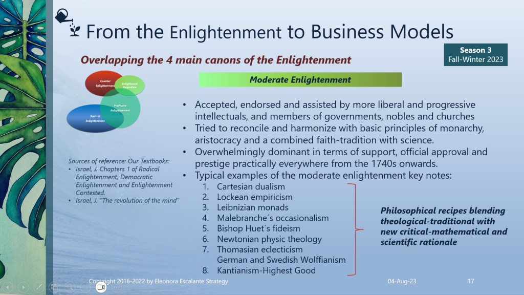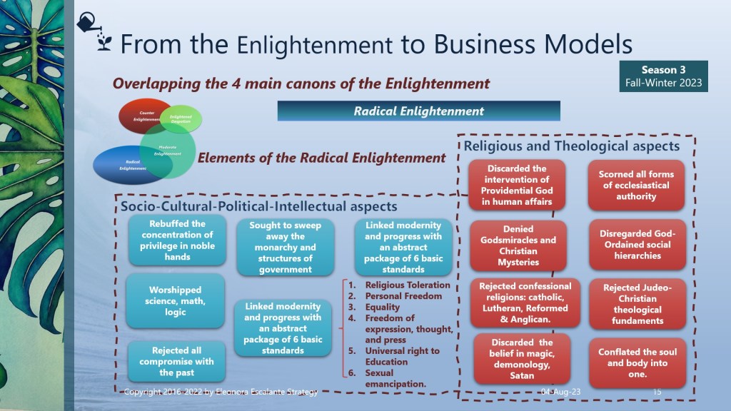 I invite you to learn the definitions and differences of the Enlightenment quartet of compositions that are still outstanding, and you will truly comprehend why is more decisive than ever to go back to the past and find out from where are we living all this mess, today. Every canon that I will describe today and in our next publication is clearly reflected in business, economics, and corporate strategy. Probably you will find hybrids of the philosophical roots of any of these canons, but the Enlightenment is far from being finished. At least meanwhile human beings still work under free market mechanisms and private ownership, the Enlightenment is omnipresent, and we are required to understand it.