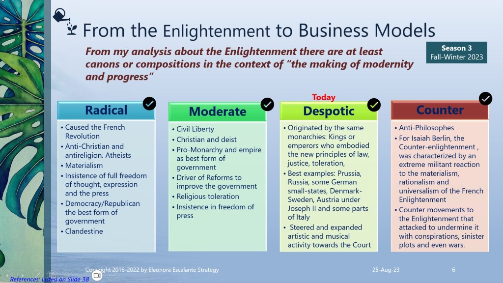 (1) The Counter-Enlightenment before the French Revolution. The first wave of the Enlightenment was a slow association process of the Enlightenment ideas and discoveries to the scientific method and the experimental practice; with its climax development during the 17th and 18th centuries. In consequence, any counter-enlightenment response was a rejection, a counterargument, or defeat or opposition to the radical, moderate, and despotic enlightenment that took place before the year 1789. Remember that our object of affection, here at our epic “From the Enlightenment to Business Models” remains in this period. We are narrowing our current saga by exploring what occurred before 1789. But our readers must be alert that since the Enlightenment has continued to our days, then of course we are required to continue learning after 1789 to our days.