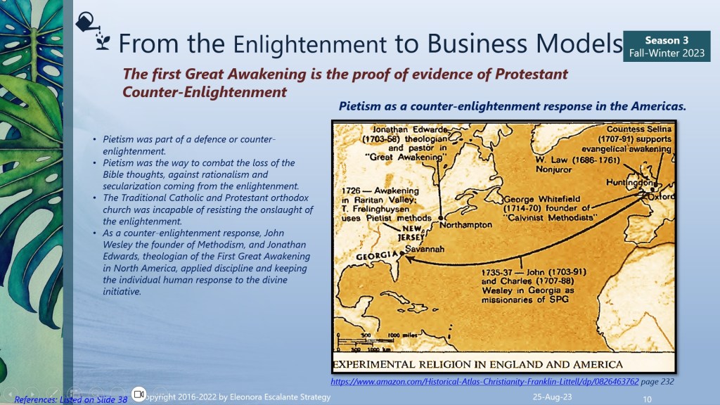 As you can infer from the last section, the first phase of the Enlightenment did not stay in Europe only. It also traveled with the Europeans to the Americas. In the North American region, the Catholic church wasn´t omnipresent. The immigrants who settled in the first half of the 18th century were searching for freedom and religious toleration. The link between Protestant Christianity in North America with the Enlightenment ideas was obvious. During the first waves of immigration (see slide 10), Protestant Christianity was spread by military conquest and political expansion. With pietism, the individual conversion revolutionized the expansion of Christianity. For example, Nikolaus Ludwig, the Count Zinzendorf (1700-60) moved from Herrnhut and founded several Christian Conservative communities in Europe and America (4a). The Pietists from the Protestant part of Germany worked with the American Indians of Pennsylvania and Ohio. Then John Wesley (1703-91) the founder of Methodism and Jonathan Edwards (1703-58) theologian of the Great Awakening joined Massachusetts. George Whitefield (1714-70) also bonded in Georgia and several other states. The 18th-century awakening “clashed fundamentally with both Moderate and Radical Enlightenment in the United States” (5). With these pietists, a new counter-response to the Enlightenment was emerging, in the same cradle of Protestantism. The Great Awakening is the validation and demonstration of the counter-enlightenment in North American Society during the 18th century. The first Great Awakening as a revival of protestant conservatism took place among the Dutch Reformed, Congregationalists, Presbyterians, Baptists, and some Anglicans, all of whom were Calvinists (4). The Great Awakening as a counter-enlightenment apparatus in Colonial North America proliferated in two formats: