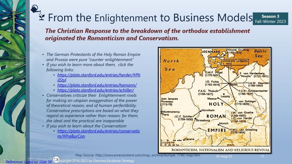 - Philosophes of the Counter-Enlightenment: In this section, I have complemented it with 4 philosophers, who also have been named by Isaiah Berlin. These 4 philosophes were heavyweights in the counter-enlightenment: the East-Prussian Johann Gottfried von Herder (1744–1803), the Italian Neapolitan Giovanni Battista Vico (1668–1744), the Prussian Johann Georg Hamann (1730–1788) and the Swiss Jean-Jacques Rousseau (1712-1778). I would add here J. W. Von Goethe (1749-1832), who is more recognized for his literary works, but he was also a counter-enlightenment representative from Weimar, all together with Johann Christoph Friedrich Schiller (1759–1805). Look at the slide 11. These last 3 philosophers were Christian by faith, and they stressed romanticism, spirituality, poetry, and artistic sensibility as innate human qualities (8). The counter-enlightenment authors who were alive and saw the effects of the French Revolution, took refuge in Romanticism, dedicating their last years to theater and writing plays, poetry, and other abstractions with the deep affirmation of natural human gifts capable of either good or wrong demonic consequences.