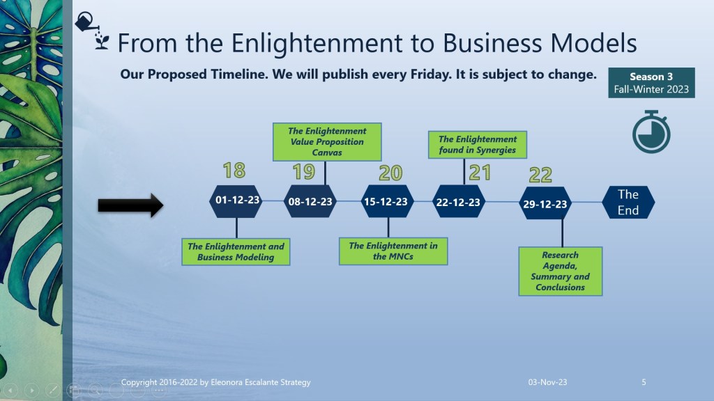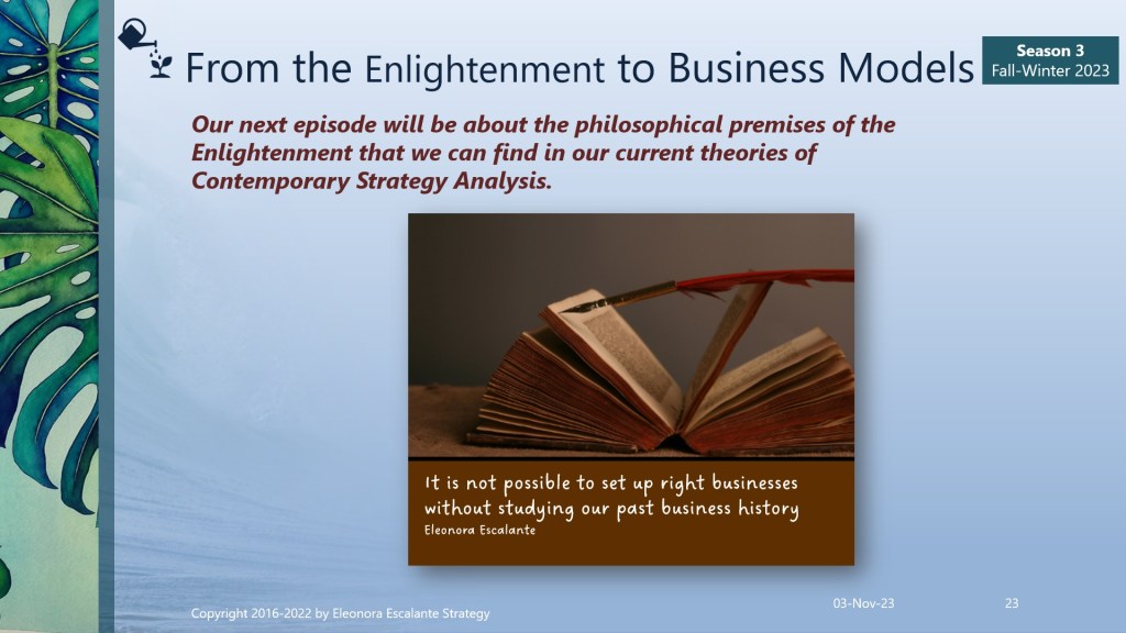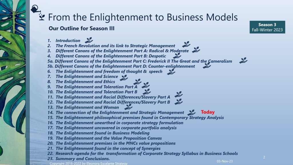 Announcement. We have uploaded the complimentary publication successfully. When I do not publish all the strategic reflections on Fridays, it is because I am considering new content beyond the boundaries of the outline, that requires my attention before publishing. During the weekend, it is important that you read the slides, ask yourself questions, and then search for additional information in our bibliography (slides 21 and 22). Then on Monday, you can compare your reflections with ours. That would be the only way that you will learn to practice. The following episode (to be published next Friday 10th of November) will be “The Enlightenment Philosophical Premises Found in Contemporary Strategy Analysis”. Blessings and thank you for reading our episodes.