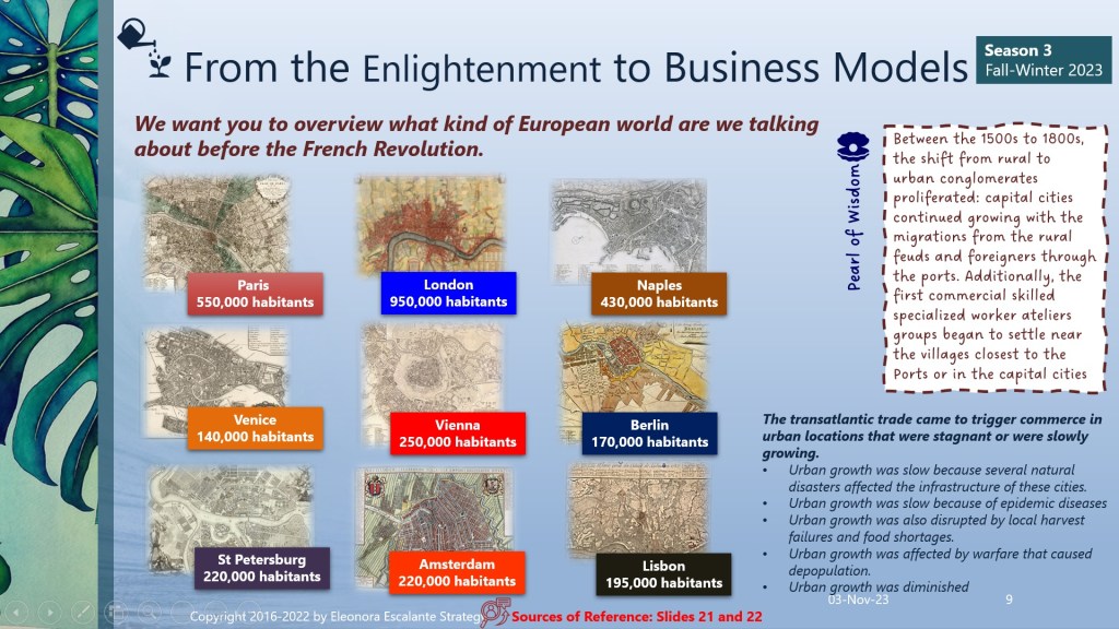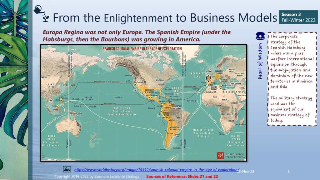 Who was making corporate strategic decisions in this period of transition? These 5 strategic directions were occurring all together at the same time. The urban conglomerates were growing in a disordered manner, migrations from the rural settings to the cities didn´t stop (see slide number 9), and we must ask ourselves? In this context, who was making the decisions for the prosperity of those cities? Do you think the kings or queens and the royal courts? Or was the intellectual group all together with the new merchant class who were involved in the American transatlantic and Asian trade? The treasures of the new world were so attractive for each and all the competitive nations in Europe. To secure the map of Europa Regina (see slide 7) was the Spanish-Habsburg crown game, played formidably, but it was with the purpose of guaranteeing their dominance of the lands in the New World. All the matrimonies that succeeded between monarchs of royal heirs between 1500 to 1800 were driven by the consolidation of the new territories in the New World. Spain was defending its empire (with all the strategies and tactics they could imagine), through strategic alliances of marriage, warfare, and settling colonialism quickly and without non-stop measures. This is why they didn´t care for the indigenous natives as much as the Catholic Jesuits wished. When the Bourbons took the spotlight crown in Spain, France, and Italy, the rest of the Holy Roman Empire were trying to consolidate their positions in Europe to extend it to America. But warfare continued.