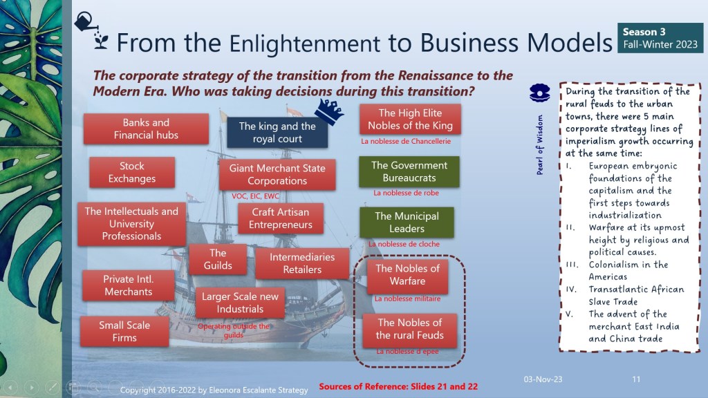The New European World of the Enlightenment. Just think for a moment about the following idea. If the intellectuals of the Renaissance were the first polymaths under the Catholic Canon who disrupted their societies; and their followers (including Descartes) flourished during the Enlightenment to build a critical mass (200 years later); then a new brainiac class with a strong network emerged slowly. The intellectuals of the Enlightenment, all well-prepared from the best universities, included the nobility in their own societies. Then the needs and wants of freedom for this new class of citizens were imperatively different. It was natural for the new class of intellectuals and university professionals to try to publicize their new paradigms. And they did it through books, salons, the same universities, etc. See slide number 11. In addition, if the studious class was used at the Court and the monarchical new state organization, this new government was the result of the same intellectuals who needed a new structure to comply with the requirements of new societies in metamorphosis. The transition from the rural feuds to the urban towns was hand in hand with 5 corporate strategy lines (in all the empires participating in the expansion of new colonies outside of Europe).