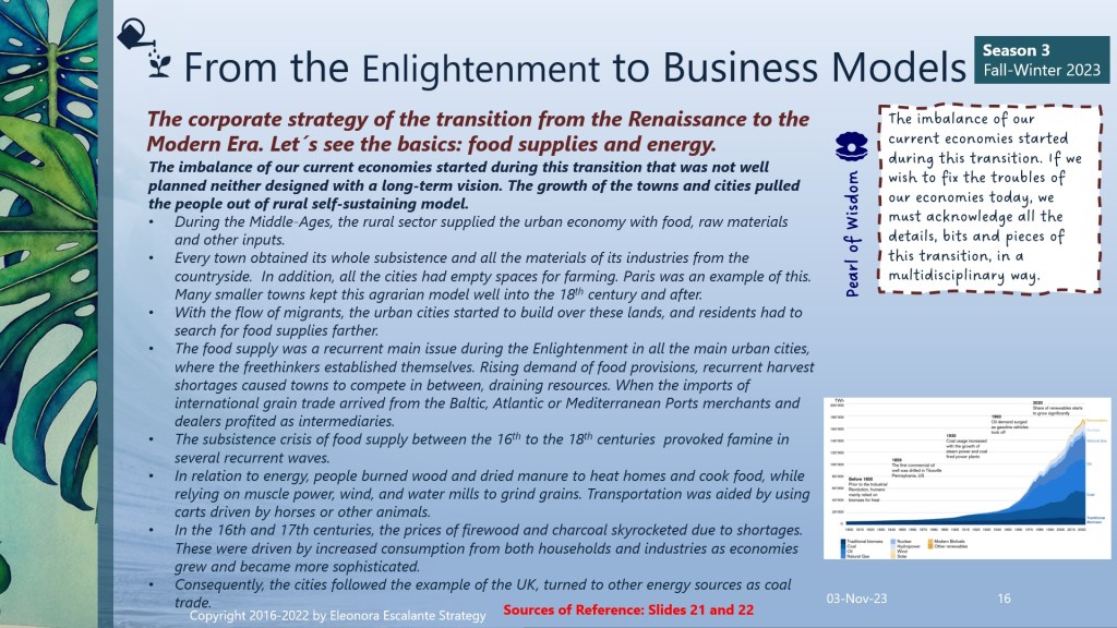 A dynamic transition was stirred between the end of the Medieval Age and the French Revolution. It was during this frame of time that the Enlightenment freethinkers were able to open new ideas on how to organize the countries in a different way than the feudal monarchical states. In this context of transition, the strategic management of the monetization of resources also shifted. But slowly. This change which was uniquely led by the kings and the emperors; began to shift from the “ancient regime of leaders” as the agents of warfare, to a new private emerging merchant class of the urban cities, in which the government-private giants of trading (the first MNCs of our history) distinguished as the top “business” of the epoch. Please read slides from 16 to 20. We explain the corporate strategy of the transition from the Renaissance to the Modern Era, on several levels. First, we overview the sector of food supplies and energy. Famine was a serious repetitive issue in Europe, particularly during the 16th and 17th centuries. In the middle of warfare, and after the War of the Spanish succession, every nation in Europe was fiscally drained. England was trying to sell their own resources to raise money to pay for the warfare, and coal was the prime material of excellence for it. By this time, England was already in possession of most of the land in what is now the United States of America, and the marriage between William III of the United Provinces with Mary II of England, came to reinforce it.