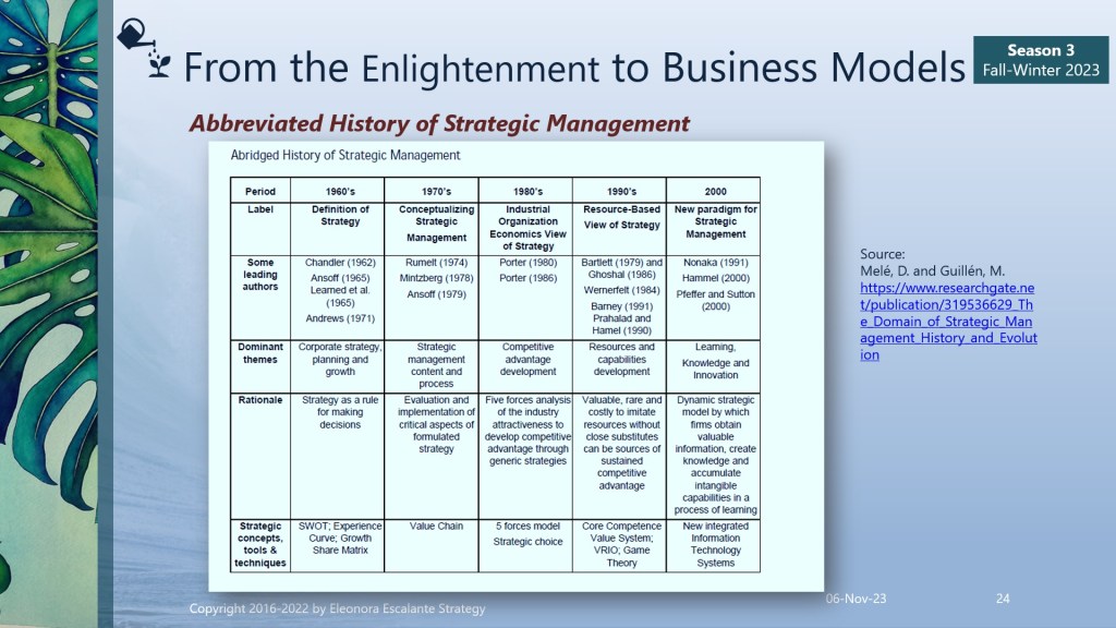 What is strategy? Strategy as far as we can define it, is still a work-in-progress word. Why? It is simple. For more than 6,000 years, the word strategy was linked to warfare. Our past economic systems functioned under the premise of war, and that is why we are currently living with such a diverse connotation of definitions for this word. Professors Manuel Guillén and Dominic Melé from IESE have prepared a lovely table that explains “partially” the history of strategic management as of the 20th century. Look at the slide below: