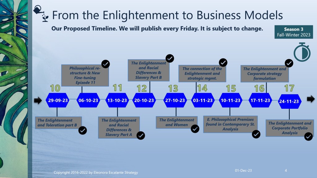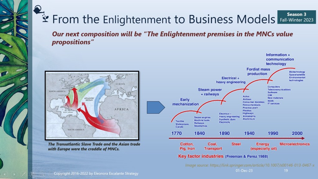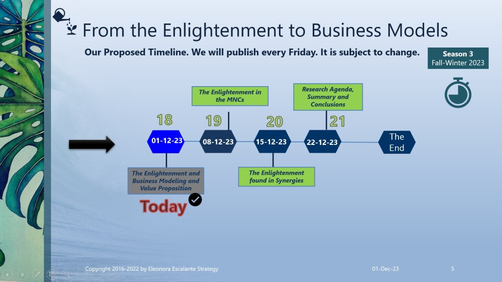 Adorable readers, we appreciate your desire to learn by doing your own strategic reflections with us. This weekend and the next two are the last ones of this saga. So I won´t leave you with homework for the rest of 2023. The following episode (to be published next Friday 8th of December ) will be “The Enlightenment Premises in the MNCs value propositions“. Blessings and thank you for reading our episodes.