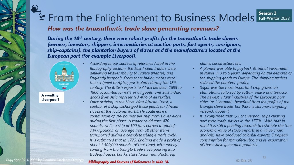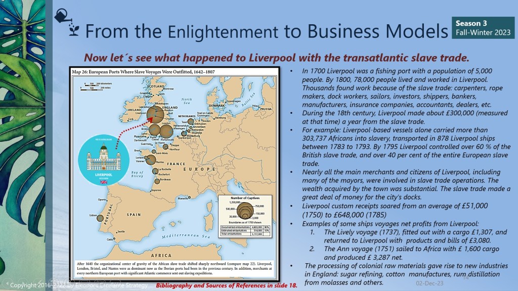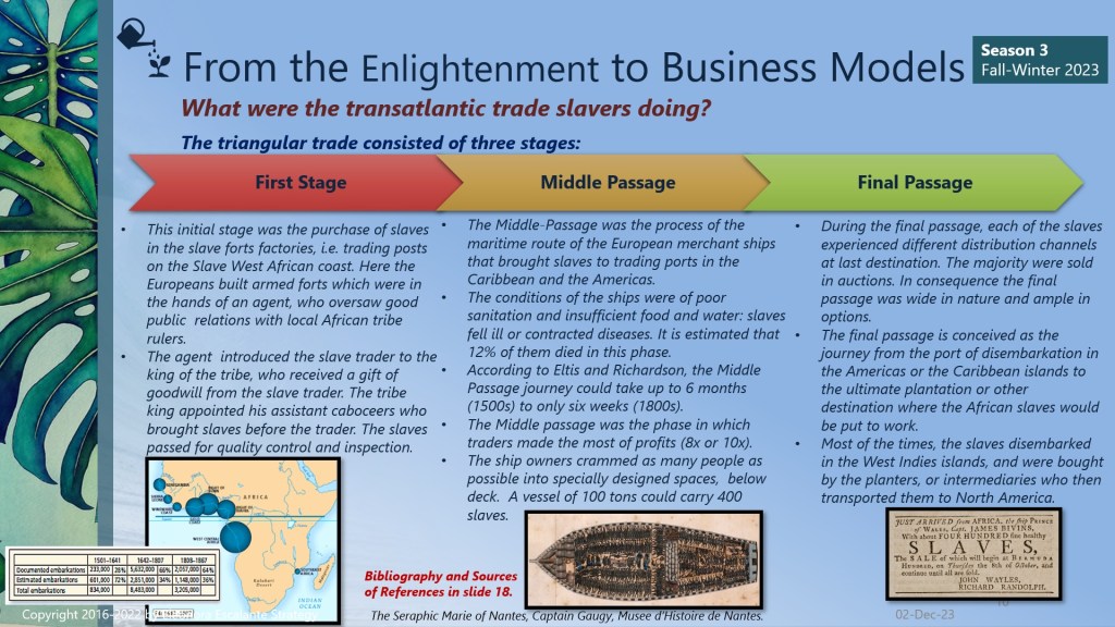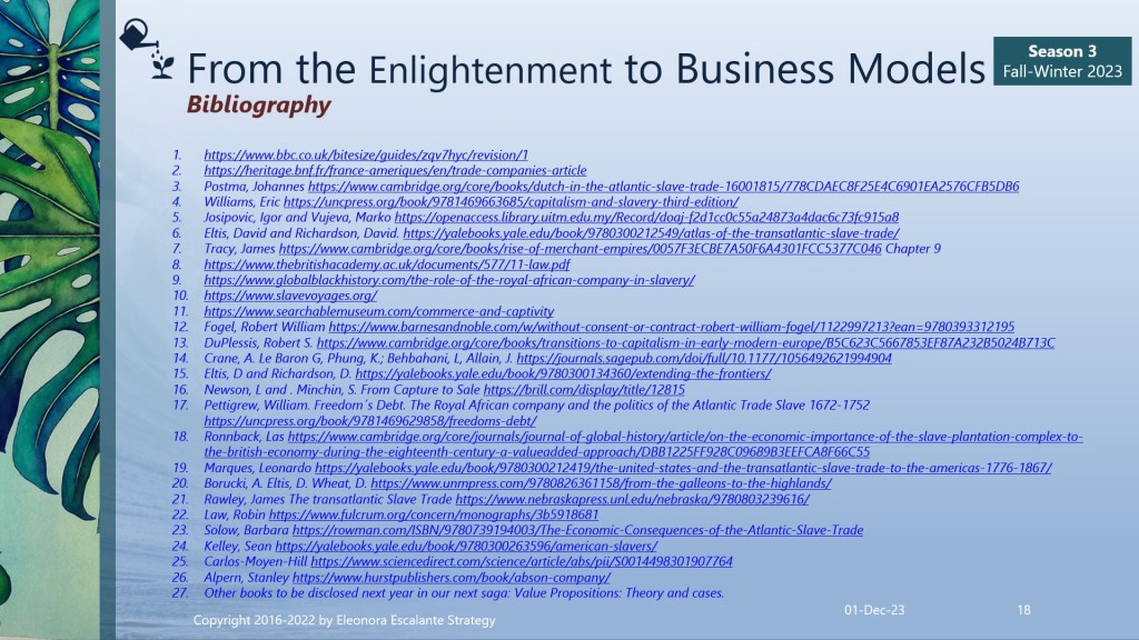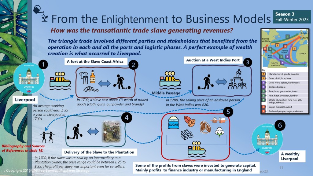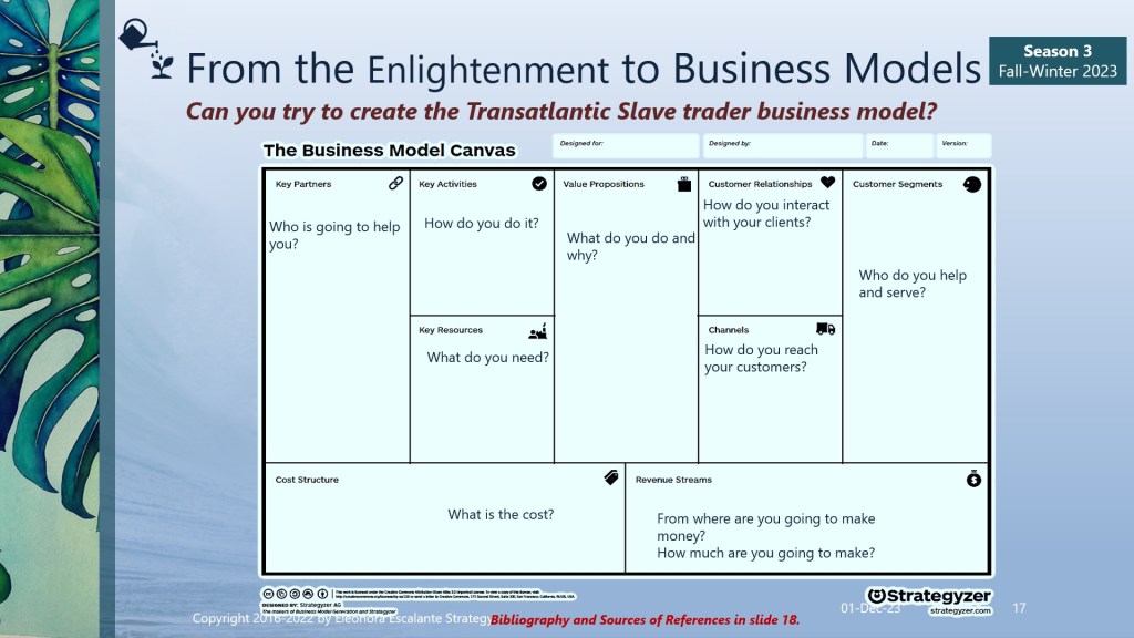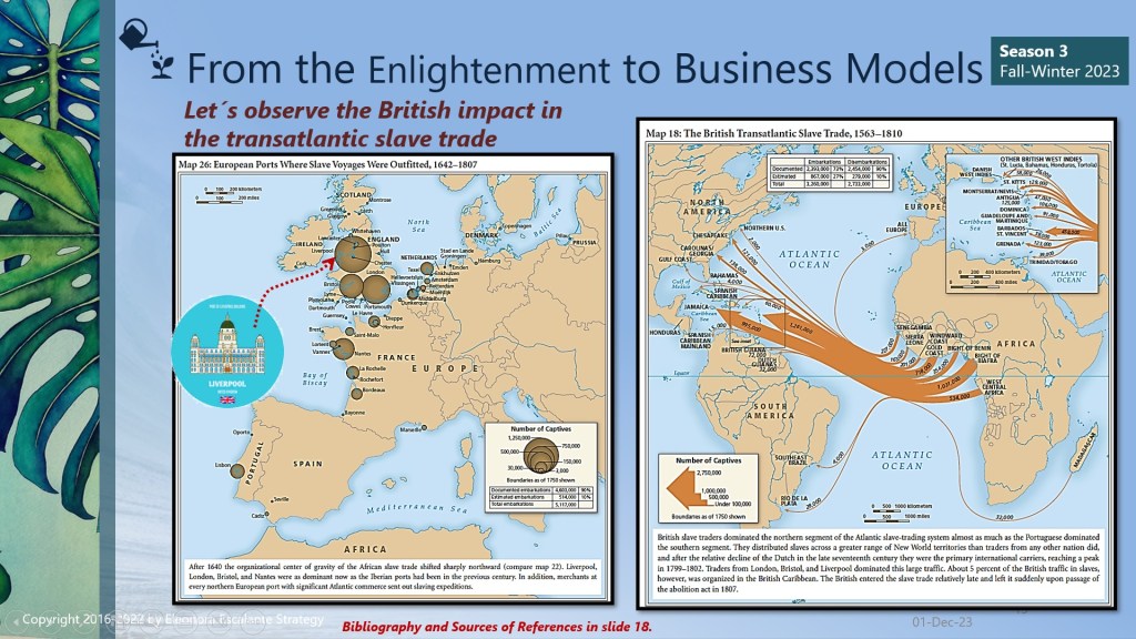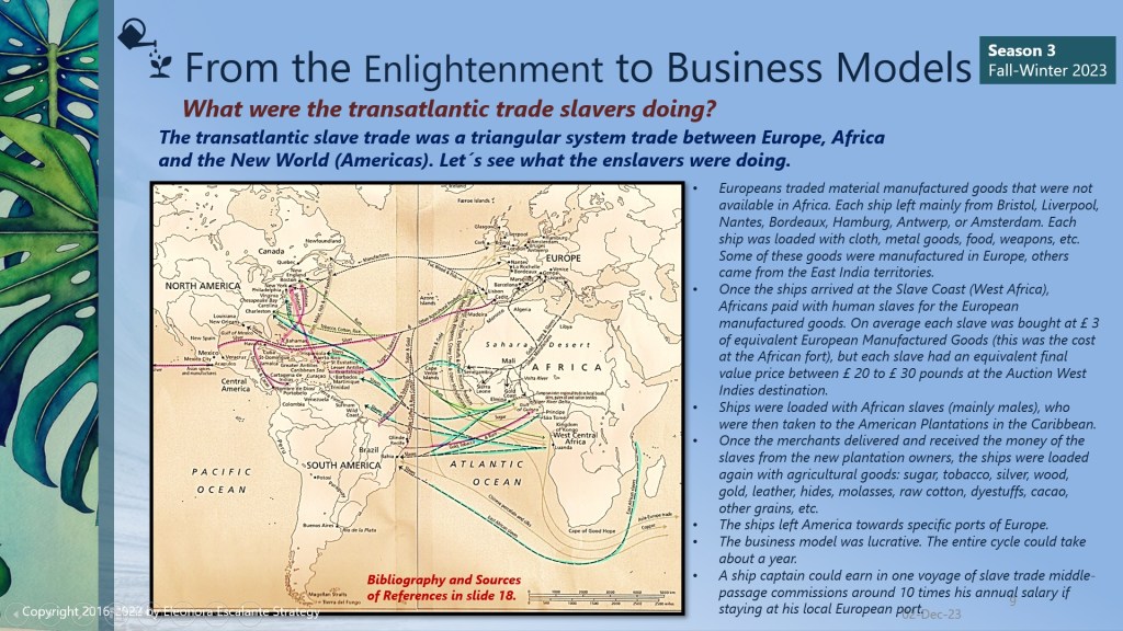 Finally, since we are approaching the end of season III of “From the Enlightenment to Business Models”, we can´t close this saga without mentioning that every single element of how we do business modeling today has its origins or is linked to the philosophy of trade that was installed in our civilization brains during the Enlightenment. The merchants of the ports of Amsterdam, Liverpool, Nantes, London, Bristol, Lisbon, Habana, La Rochelle, Recife, Le Havre, Bordeaux, Rhode Island, Middelburg, Seville, St. Malo, and Cadiz, and the Brazilian Rio de Janeiro and Salvador da Bahia; are the proofs of evidence or the verifications of how the slave-trading voyages were organized between 1501 to 1867. Our mentality of doing business today has been encouraged using the rationale of that epoch. Certain aspects have evolved for the better, but still, millions of people are working under “modern slavery” terms.