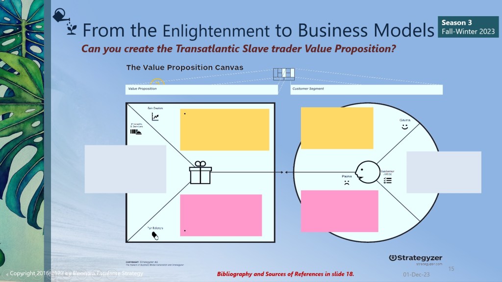 Last Sunday, we decided to make a public announcement: we will produce a new saga about value propositions for the Spring Season of 2024. At the same time, we will elaborate our outline considering a different approach on how to learn the art of designing value propositions. We have decided to use the transatlantic slave trade as the kicking-off example of the theoretical explanation of how to develop value propositions and business modeling. We will also provide plenty of current examples of the 21st century, and we are delighted with how is going to be. Since we have already promised a chronicle of “A Glance to the Foundation of Business: Women, Warfare and Slavery”, we decided to include some of these views or elements in the first example of the value proposition about the transatlantic slave trade. So, there is amazing content coming for you.