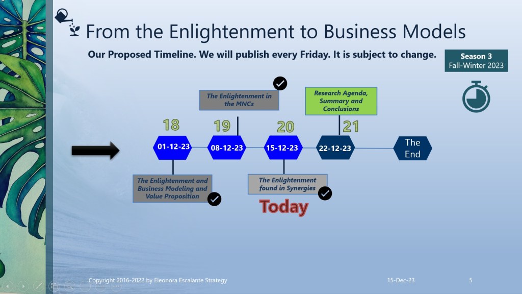 Adorable readers, we appreciate the patience that you had with us during the year 2023. It was a hard one for us. But we always deliver our promises to all of you. I am overjoyed with gratitude to all of you, for staying with us for three consecutive seasons. We have almost finished our discovery journey. The following episode (to be published next Friday 22nd of December) will be “Research agenda for the transformation of corporate strategy syllabus in Business Schools. Summary and Conclusions“. Blessings and thank you for reading all our episodes.