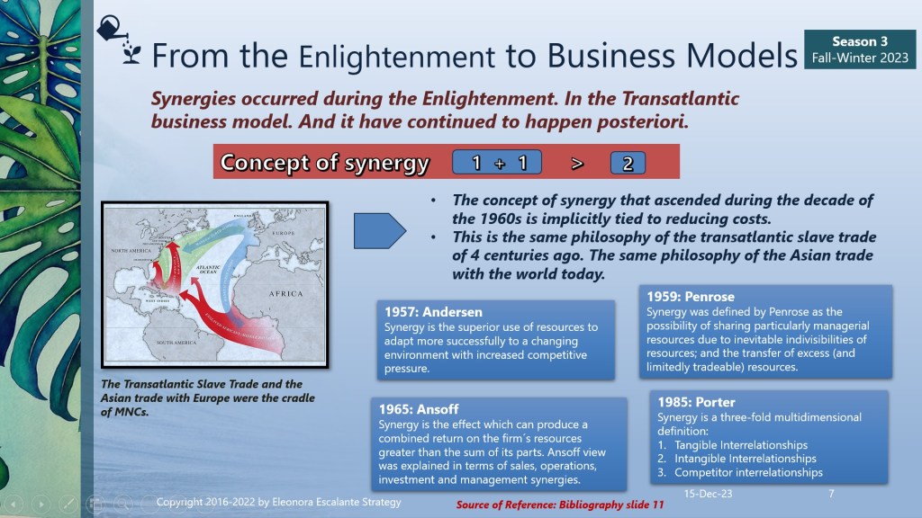 For the sake of our domain of action, any corporate strategist will always clap hands linking the term synergy with mergers and acquisitions, one of the ways companies can grow. Once we hit the value proposition of adding two companies to reach synergies, then we immediately take a step into the “show me the money” ground, the premise that has accompanied us since the instance of building networks of commerce, an endeavor that has existed since more than 6,000 years ago. The world of trade and commerce was always around the Levant region, back and forth with the Mediterranean coast countries. It also extended its roads to China, passing through India. However, after 1492, it walked up in extension and distance: the first global endeavor of what we know as the transatlantic trade began. This business model included African slavery as the cheapest resource for the management of the extraction of the riches of America.