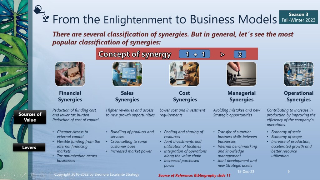The rhetoric of the “synergy” term used during the Enlightenment period has an ample umbrella, in implicit terms, that ranges from an abstract definition to the smallness of the technical synergies that are used today to measure the value of a merger or an acquisition. I want to be boldly clear. Synergy today, in strategic management, in the year 2023, has been narrowed to an undersized narrow line. Consequently, I wish to express that the concept of synergy coming out of our domain is small and slim. In addition, I do not want to enter into the explanation of the application of this term in the mergers and acquisitions theories, because my goal has been to show you the connection of the Enlightenment with what we do now. See slide 12.