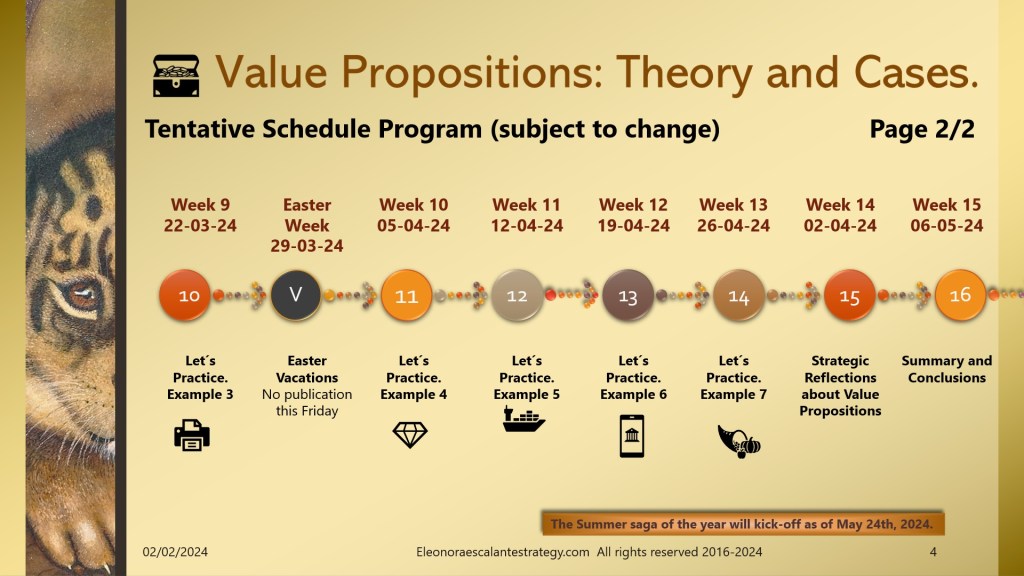 Our beloved Spring saga of the year will last 14 weeks in total. During the first six episodes, we will plunge deeper into the existing theory, covering the original philosophical and historical aspects of the notional frames of reference that have been used in the past. Particular industries have their own methodologies for business modeling, and we will also show you how to find them. After that, we will proceed with examples and practical exercises. We expect to show you at least 7 enterprises or entrepreneurial initiatives. Each of them is of a different industry. We will disclose the specific details of each practical example on the day of our scheduled publication, not only because we wish to keep a surprise effect on our readers, but also because we wish to astonish your thoughtful reflection with each of our episodes. Certainly, at least we will comprise three value propositions of products of massive consumption usage all over the world; one of the luxury industries; one related to logistics; one coming from the financial sector; and finally, we will also include one of the agriculture-food area. If there is time, I will include an infrastructure-civil works or public sector engineering value proposition example too.