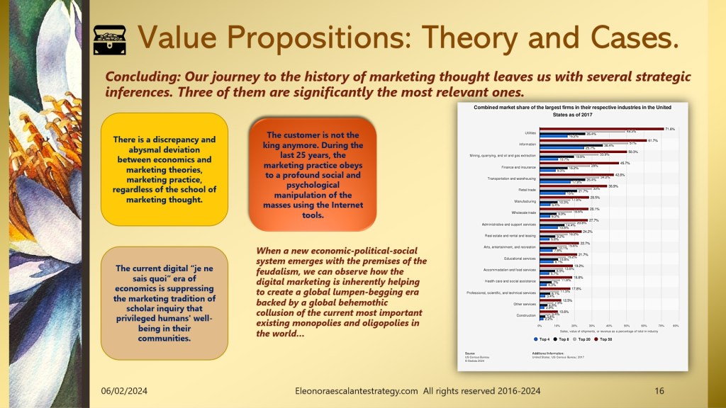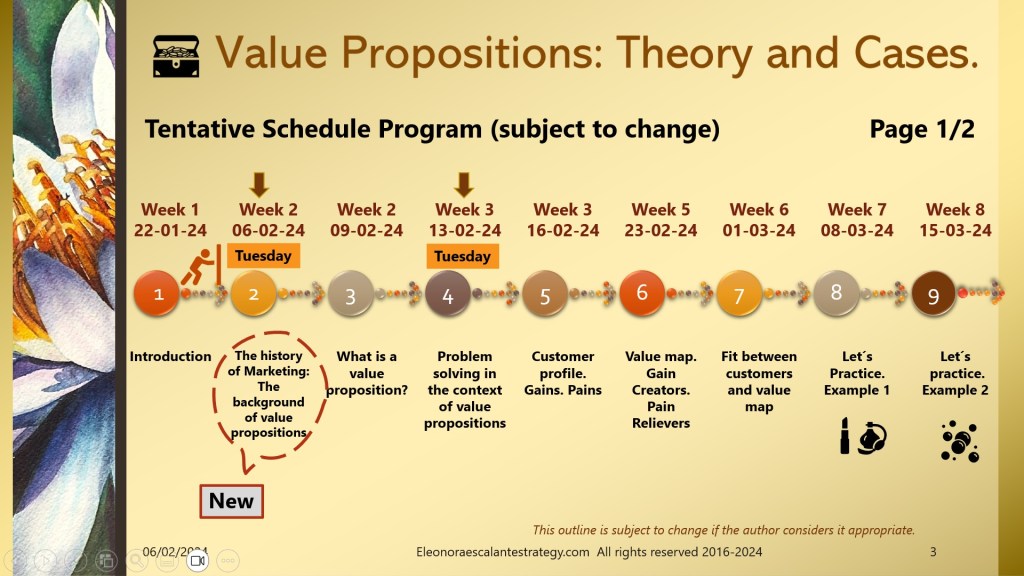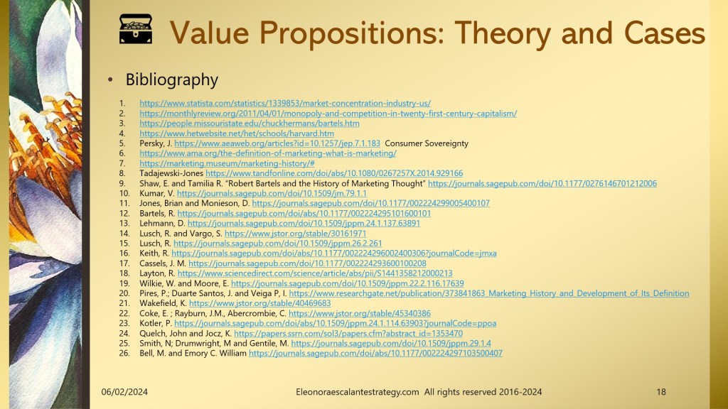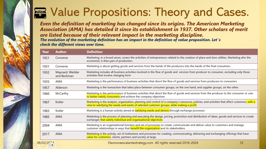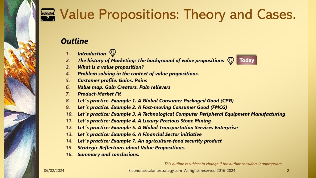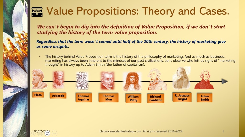 Today I have prepared a document of 18 slides that will help all of us to understand the background of value propositions, and why is it so important to understand the status of where we stand with the history of marketing thought. I have been reading a remarkable amount of academic papers, and I think we have done our best to introduce the most relevant content of it.