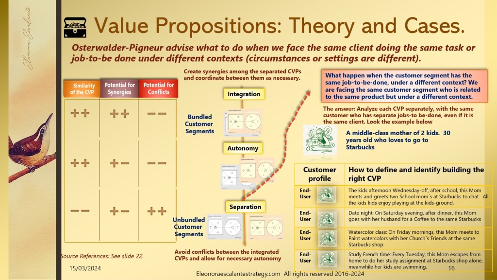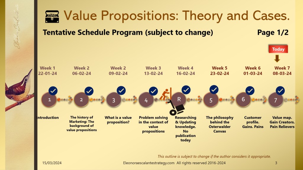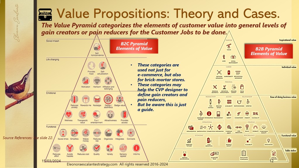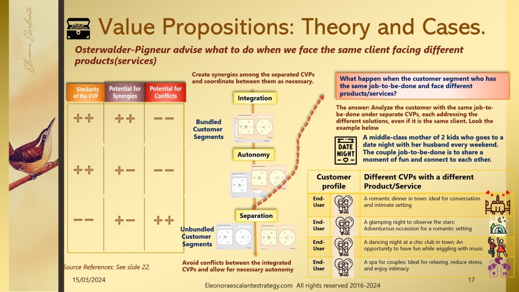 The slides that I have prepared explain the fit between the different customer segments (slide 15) in the context of normal societies, not tech-addicted communities. So I do hope you can perceive the difference with our following weeks’ examples. Let´s continue with the slides. See the example of a Middle-Class mother of 2 kids who doesn´t work (she is a full-time mother). Look at the fit in which the contexts are different (slide 16), and the fit when this mother faces different products and services (slide 17). We believe the slides are more than self-explanatory. I have tried to explain every single case that Osterwalder-Pigneur illustrated in his company´s manual. The added value that our house has provided is the link between the gain creators and pain relievers under general categories (provided by BAIN & Co), in our quest to offer you a guide of reference that may help you to not miss elements of standardized value (slides 12 and 18). These 30 elements of value (from the B2C pyramid), and 40 elements of value (from the B2B pyramid), have been established by an analysis of 3 decades of Bain Experience doing consumer research and observations derived from scores of quantitative and qualitative customer studies (4). Finally, our package of slides explored the case of a middle-class mother of two kids who wishes to go on a date night with her husband (17,18 and 19). We designed three CVPs: one in which the product/service is a romantic dinner in town. The second CVP is a glamping luxury stars night (which is more expensive and complex); and the third one, is a dancing soirée. The elements of value are situated next to the sticky note in the section of the value map, not on the left side of the customer profile. I think these slides are self-explanatory too. If you have any doubt, do not hesitate to contact me.