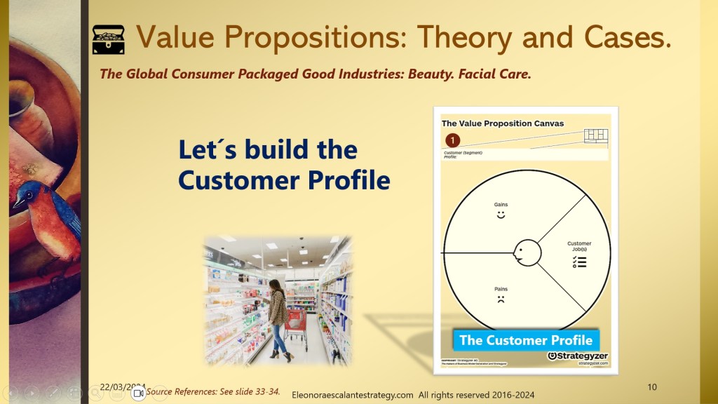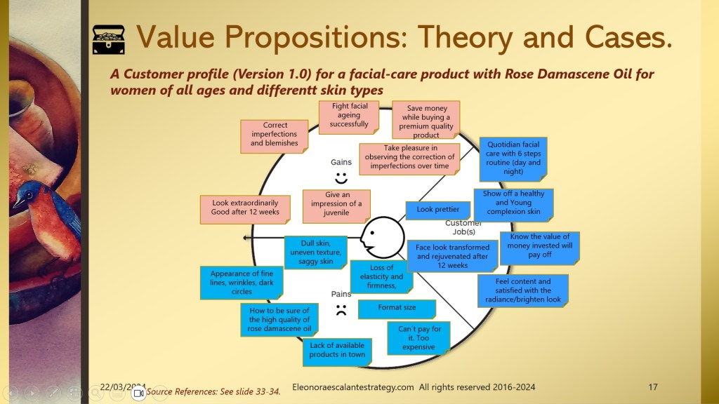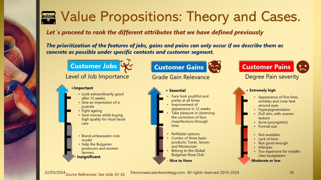 - Building the first version of the Customer Profile: From slides 10 to 17. We prepared a journey of what could be our first intent in drafting a customer profile. When segmenting a population that could be interested in buying a beauty product in which the Bulgarian Rose might be the superstar and remedy for all facial skin care troubles, can´t be conceived on the first intent. This is just the basic first approximation. Don´t forget that a value proposition belongs to a business model framework that will affect the whole exercise too.