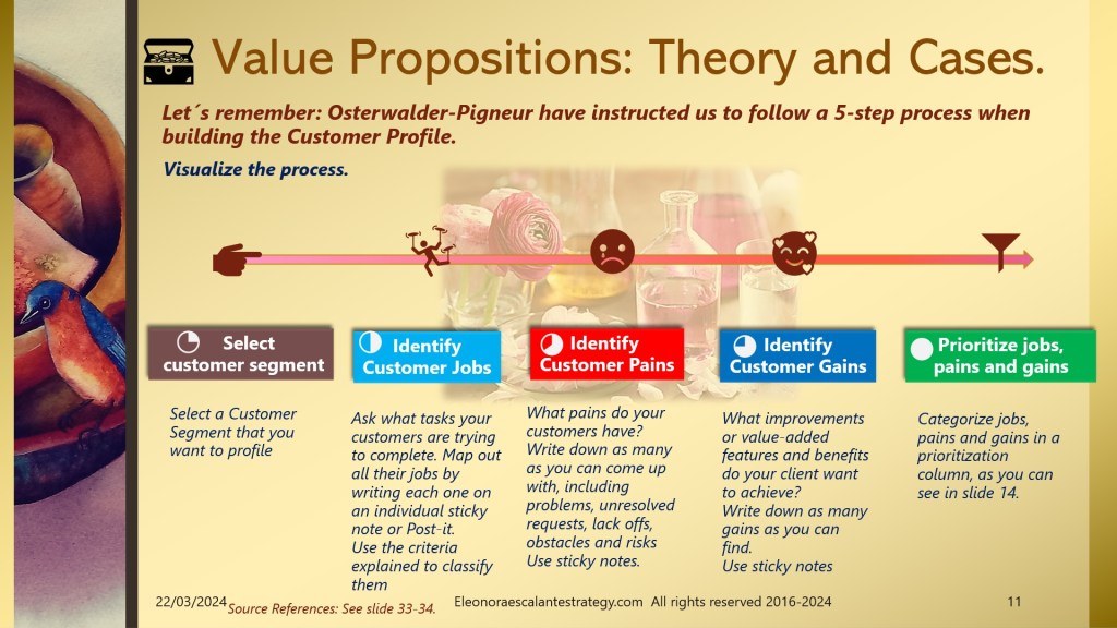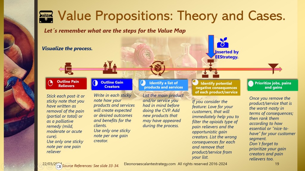 We advise you to go slide by slide trying to understand each of the components of the customer profile and value map. Particularly, center your attention on the way we get pain relievers from the pains, and how can we build gain creators from the functional, desired, or expected gains of the customers. We also wish you to take your time over the next week to explore the meaning of love in our products and services through this example.