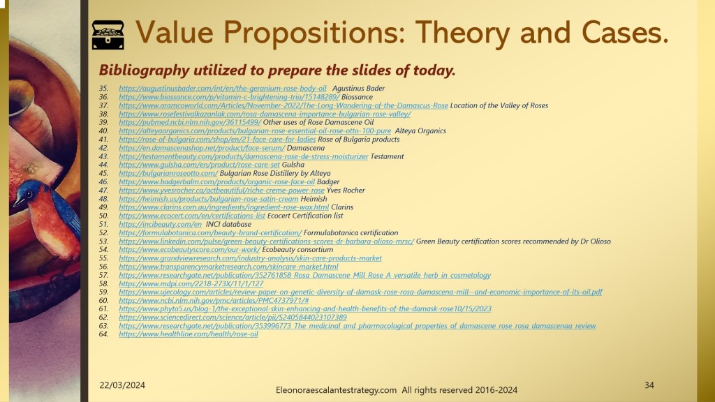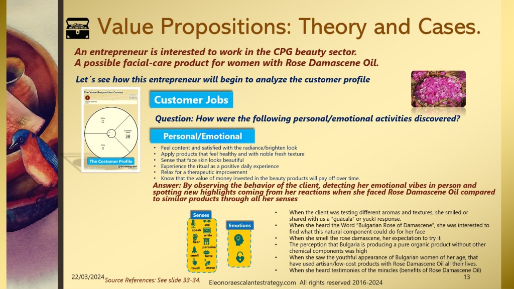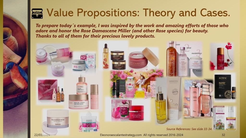 As of today, we will practice, practice, and practice all the theoretical work we have been working on since January. We kick off with an example that belongs to the Consumer Packaged Good industry, specifically, we are landing in the global cosmetics market, and particularly in the ecological organic green or eco facial skin care products. The majesty diva ingredient of today´s example is the Rose Damascene or Damask Rose planted in the Valley of Roses of Bulgaria. We will study the case of one entrepreneur who wishes to sell a unique product he has patented under the name: Elixir Bio Damascene Formula. The entrepreneur has been doing Research and Development Innovation by creating this formula for over 10 years. He is ready to explore the best alternative option for his business model. Currently, the main focus of attention is the customer value proposition in its version 1.0.