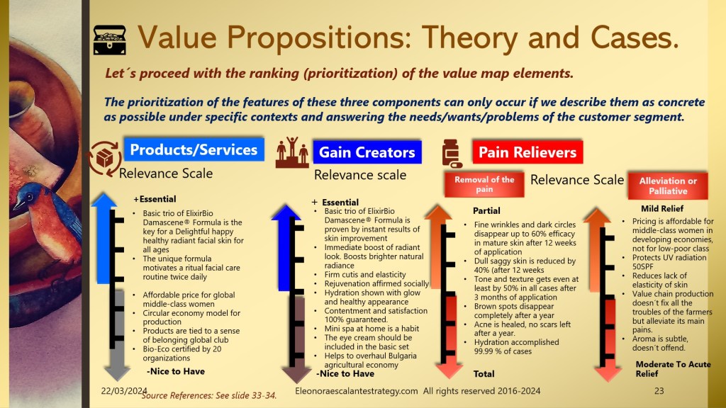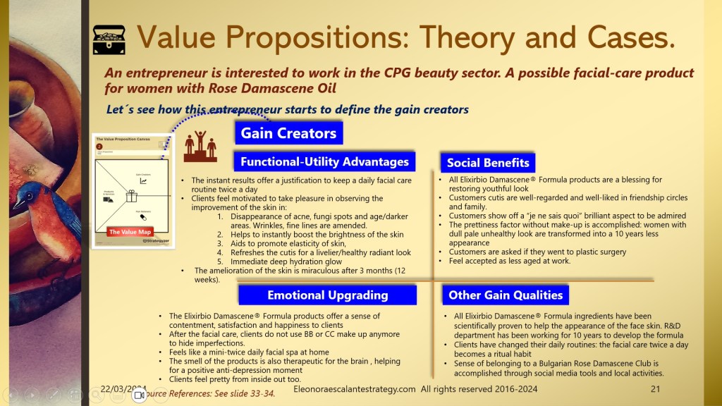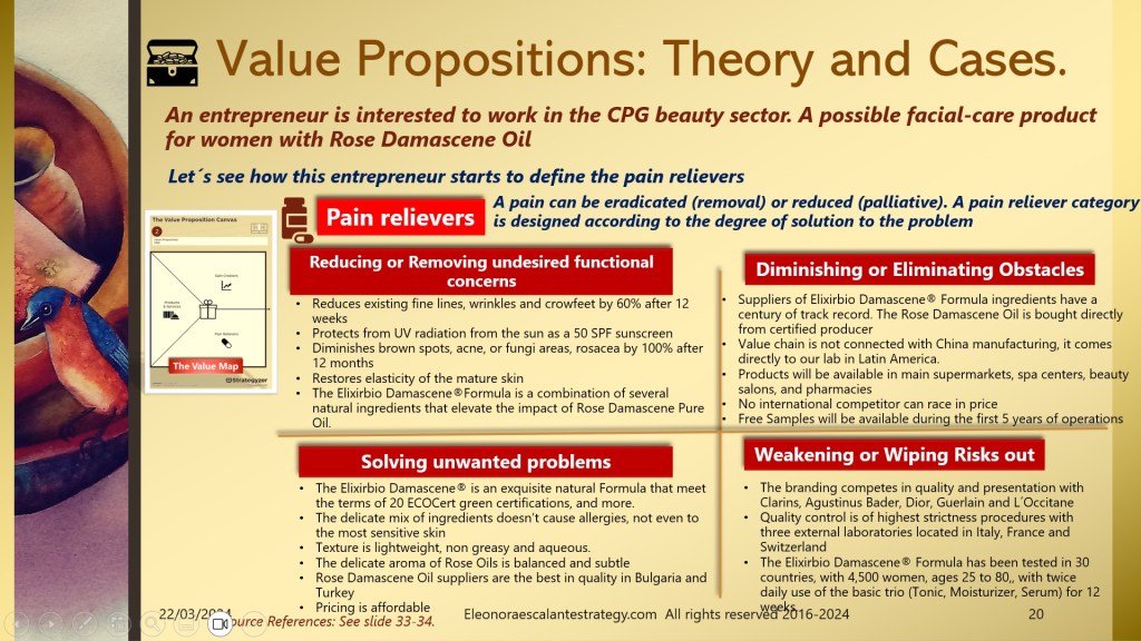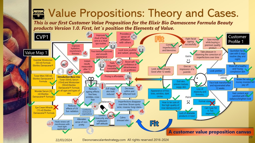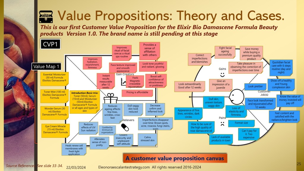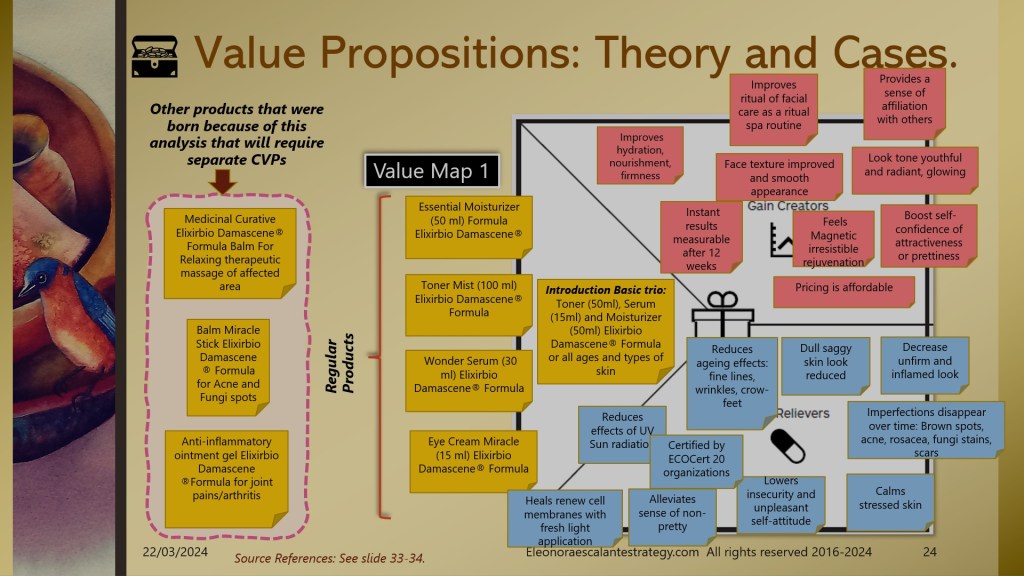 - The entrepreneur has been testing his Elixir Bio Damascene® Formula for 10 years, he is already sure and has evidence of the miraculous product in the format of the basic trio or combo of three: Toner, Moisturizer, and Serum. But we also found other needs beyond facial skin care beauty, needs that came up as pains. In consequence, we also found that other products could be designed (under a different value proposition canvas). These are listed on slide 24 as a Medicinal Balm for therapeutic massages, a Stick balm for Acne and fungi spots, and an anti-inflammatory ointment gel that works wonders for joint pains, arthritis, and sprains. Can you see the multiplying effect of using a value proposition canvas to design our product and service?