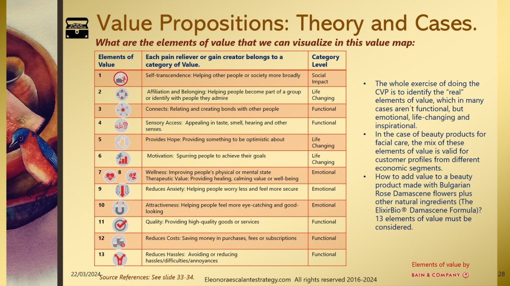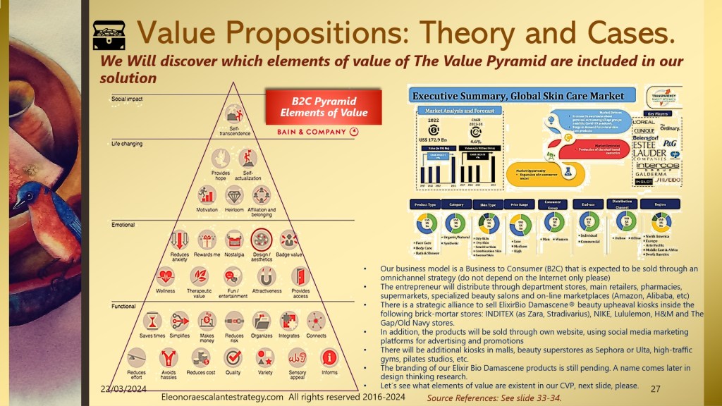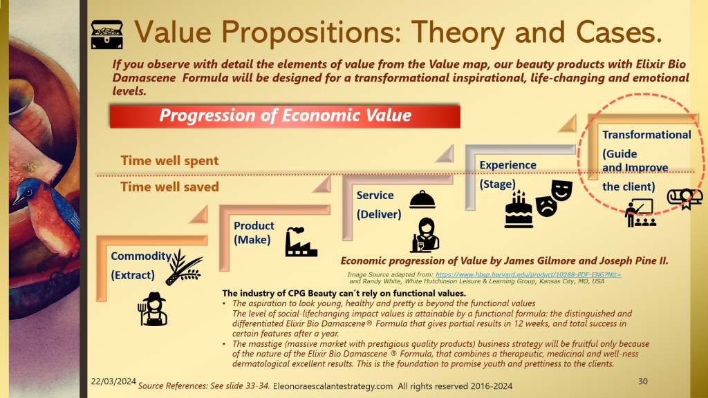 - The progression of economic value shown on slide 30, is helping our entrepreneur to don´t focus only on the commodity and product manufacturing stages. By addressing the product under the functional values we can miss the mark. Regardless of the nationality, age, or origin of women, the wrinkles, lack of skin firmness, or dark circles, can´t be cured only with an external epidermic solution. Happiness comes from the inside out, and many times it is an emotional positive attitude that helps women transform, guide, and improve their looks. By raising above the functional values of the Elixir Bio Damascene® power with the inspirational transformation (social impact changing) values, our marketing efforts will elevate our value proposition to a new level that is only well played by luxurious products sold by the most expensive beauty houses in the planet, led by Bernard Arnault, Charles Rosier, Christian and Oliver Courtin, Phillip d´Ornano and others. The business owners of sumptuous costly beauty products are experts in offering exquisite prettiness under aspirational terms. The question that attains us: Can we sell a formula that traditionally has been seen as lavish and magnificently expensive to a massive group of women from the middle class? How to transform our value proposition for a “masstige” customer segment (massive market demanding prestigious quality) without falling into the dupes?