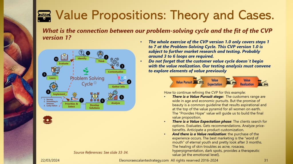- Slides 26 to 32 are self-explanatory. We have covered all the details of elements of value that might be involved in our exercise. Thirteen of them are listed on slide 28. The fit is achieved, but it won´t be ratified or totally endorsed until we test this CVP version 1.0. Testing is the only way to take our most risky assumptions into reality. The phase of testing is not part of our saga, we are interested in igniting your innovative efforts with version 1.0 only. Teasing out the CVP version 1.0 will unfold the next CVP version 2.0, and the sequence will continue.