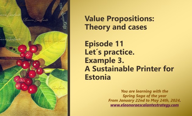 Value Propositions: Theory and cases. Episode 11. Let´s practice. Example 3. A Sustainable Printer for Estonia Wishing you all the best for this second lovely weekend of April. Today we continue with our journey of practicing how to do value propositions. Our example of this episode […] eleonoraescalantestrategy 12 Apr 2024 Leave a Comment