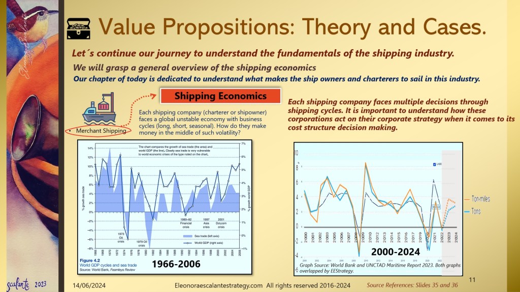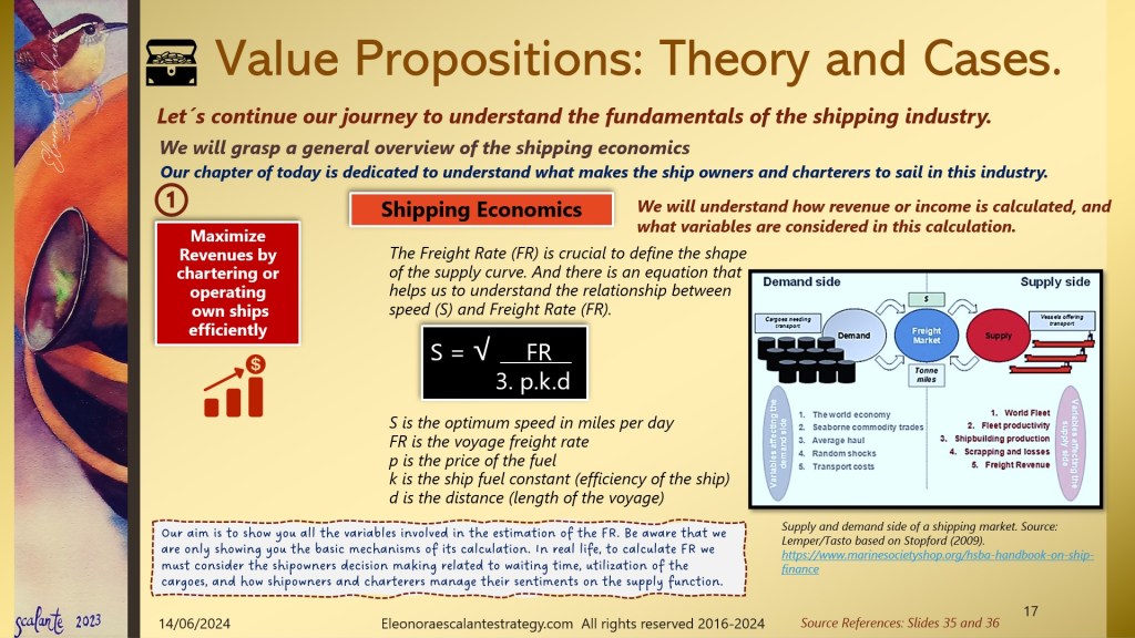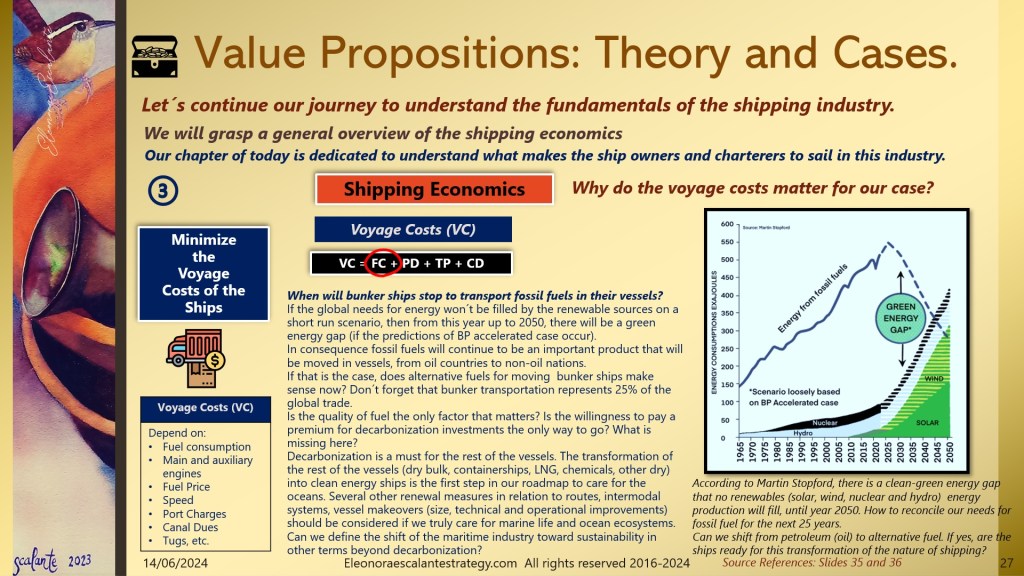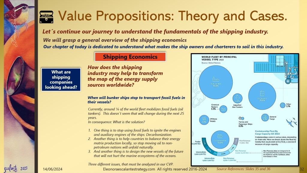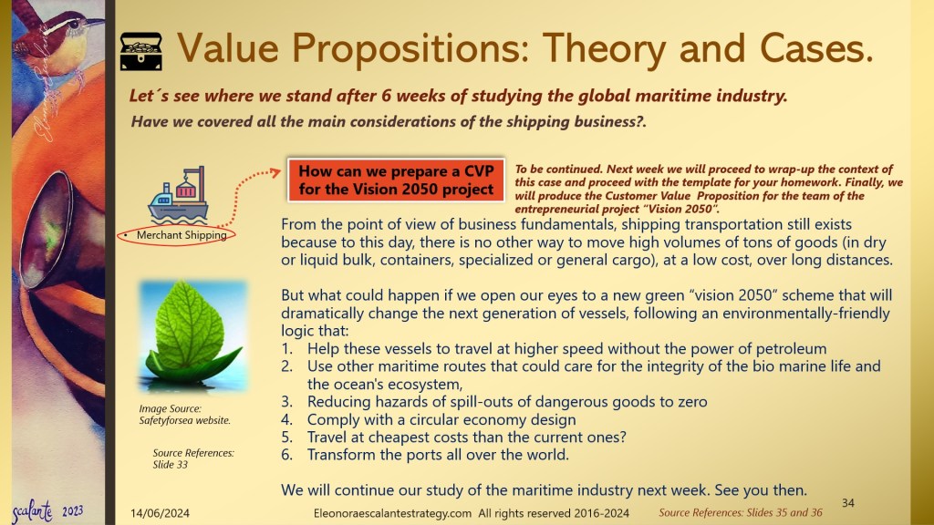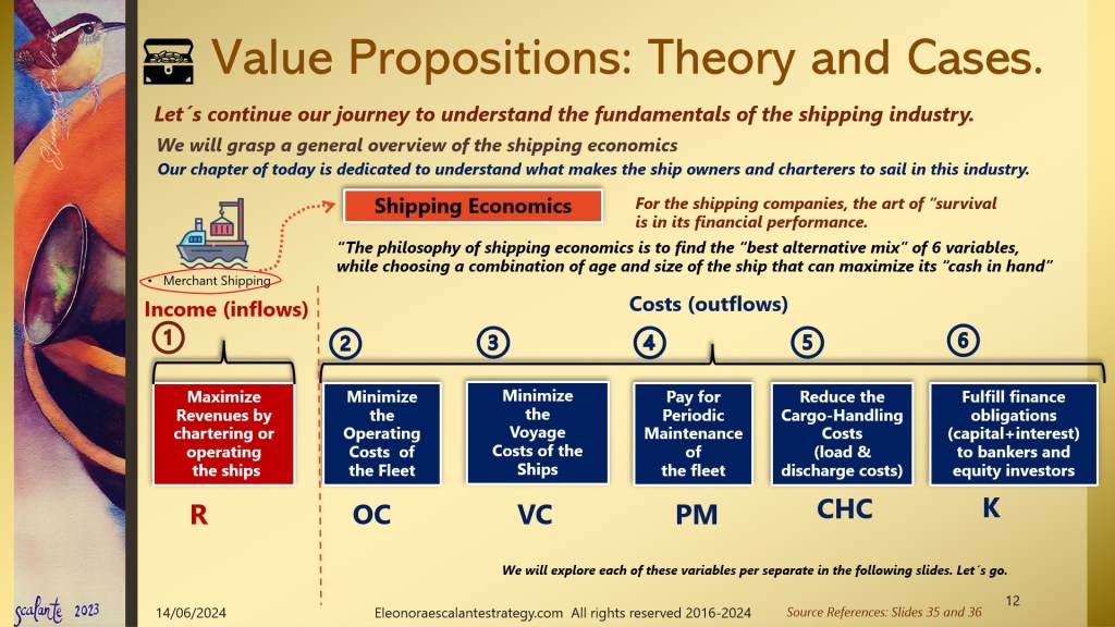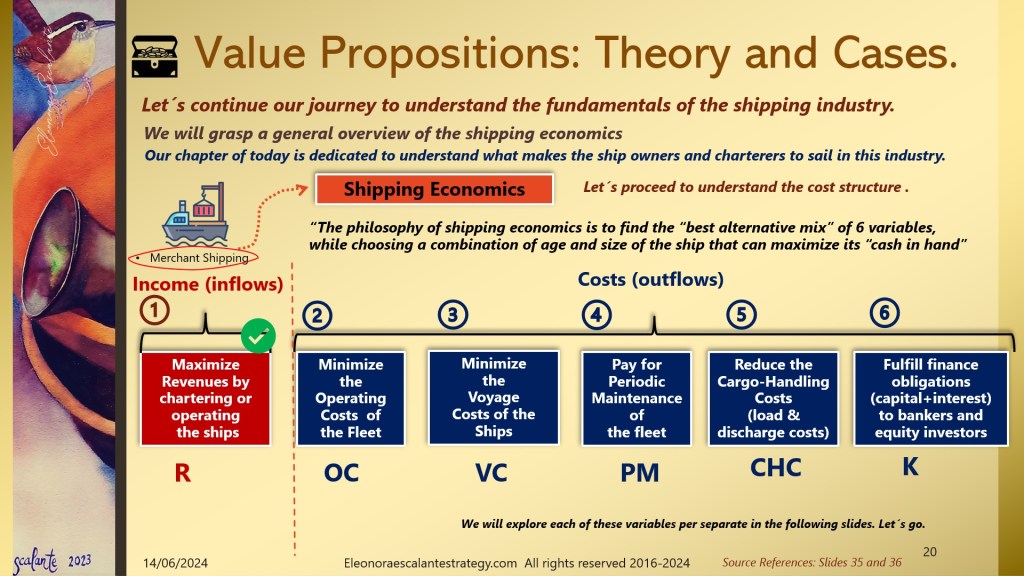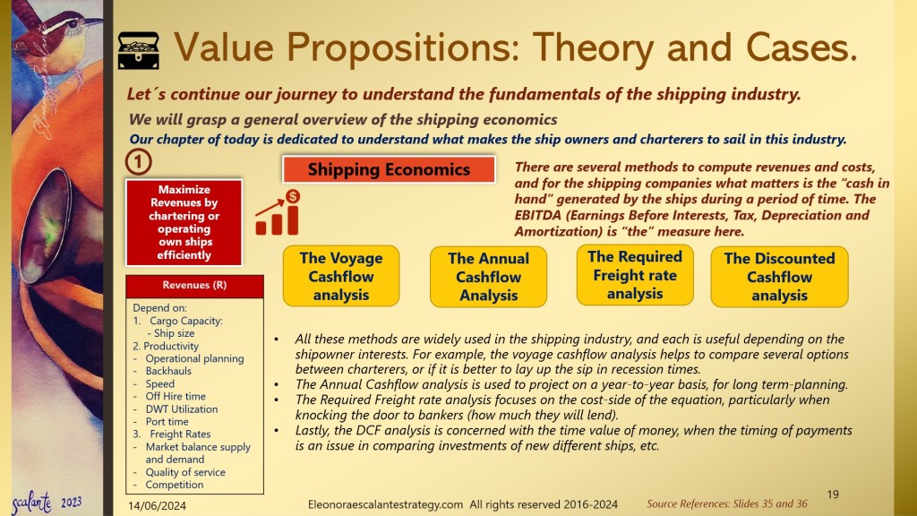 Today we will study the cost structure of shipping, and the revenue sources of the industry too. Find the following document of 37 slides. We request you to read it thoroughly, please. We have prepared the fundamentals and the most critical information that you will need to prepare the CVP for this project. Next week we will proceed with the construction of the value proposition, and this chapter is crucial for you. Feel free to download it, print it, and share it. Explore more information with the bibliography provided in slides 35 and 36. Feel free to ask me any questions through my inbox, which is located in the website tab “How to contact us”.