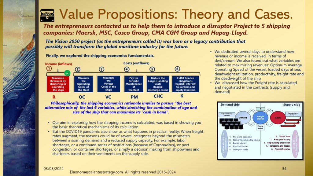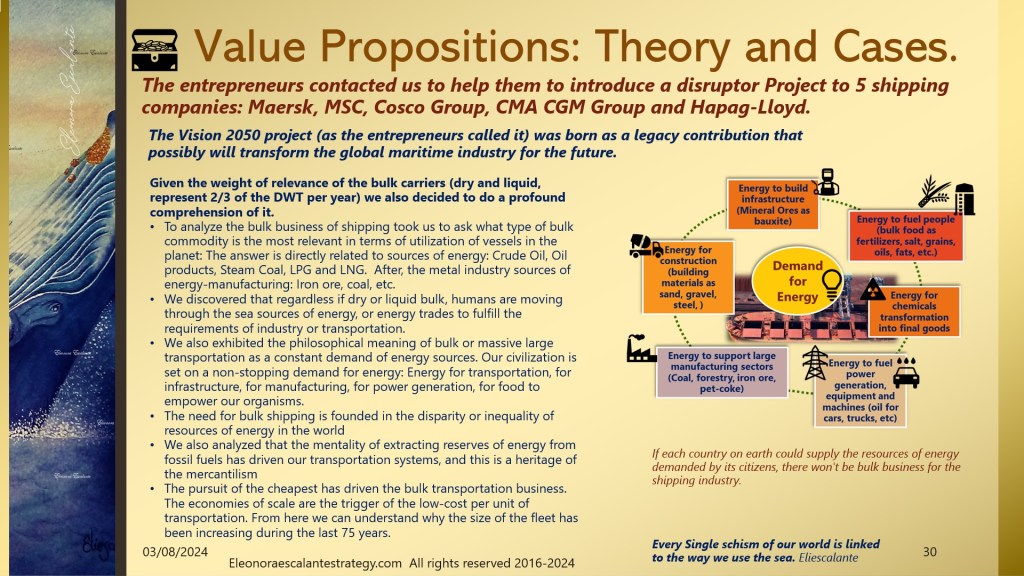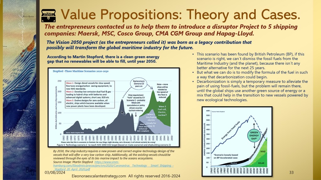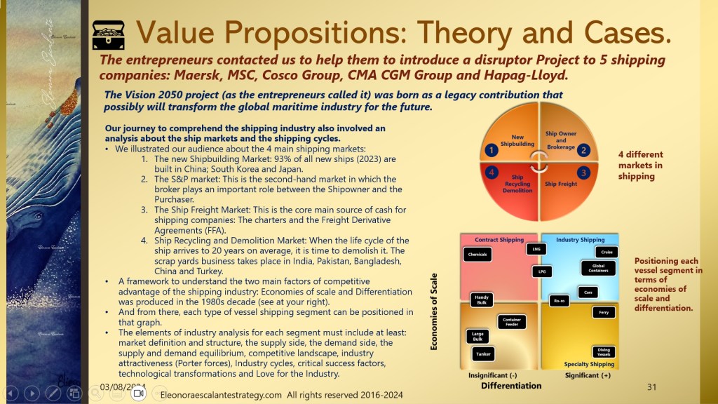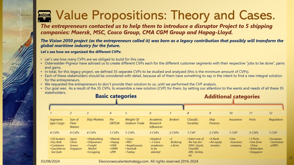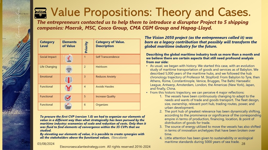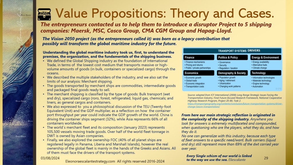 From all the practical examples we deployed, the one that took most of our time was about the global maritime industry. It was an odyssey to try to convene to the simplicity of our publications, in such a complex global industry. We appreciate your comprehension of this case (example number 5) because we extended it to almost 2 months, but I do expect it has covered all the elements required for its CVP version 1.0. We ensembled 35 CVPs in one. Magically, we believe we have done it as a foundation for any further advisory consideration.