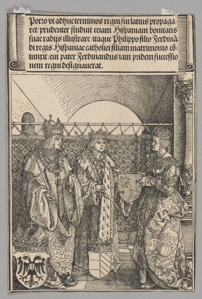 It is remarkably interesting to perceive how the different rulers of Germany before Frederick III, tiled a particular route for the Austrian Habsburgs to the Americas. Frederick III died the same year that Columbus first traveled to America. In addition, the royal house of Castile-Aragon was emerging from seven hundred years of conflicts with the Muslims, and it wasn´t possible for them (alone) to finance the discovery of a New World. The Habsburgs were also in financial troubles. Philip the Handsome matrimonial alliance with Joanna of Castile-Aragon was the beginning of a “golden fate” in which new riches were expected to arrive. It was a “you discover and buy now, I will pay later” strategy. Look at the following plate that describes the Betrothal of Phillip with Joanna, found in the art commissioned by Maximilian I to Albrecht Durer: