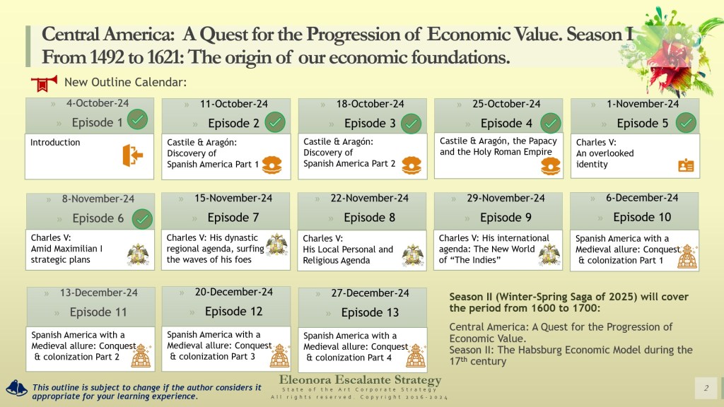 We have inserted today´s episode in our quest to provide the background of the decision-making of Charles V emperor. Without understanding the life of his grandfather Maximilian I, it will be impossible for all of us to comprehend Charles V. Visit the outline calendar that has been modified accordingly. Next Friday 15th of November, we will continue with Episode 7 “Charles V: His Dynastic Regional Agenda, Surfing the Waves of his foes”. Our next chapter will be about the life of Charles V between 1519 to his death in 1558.