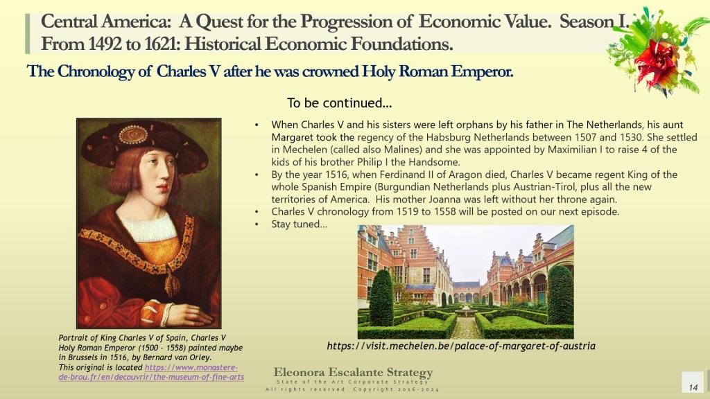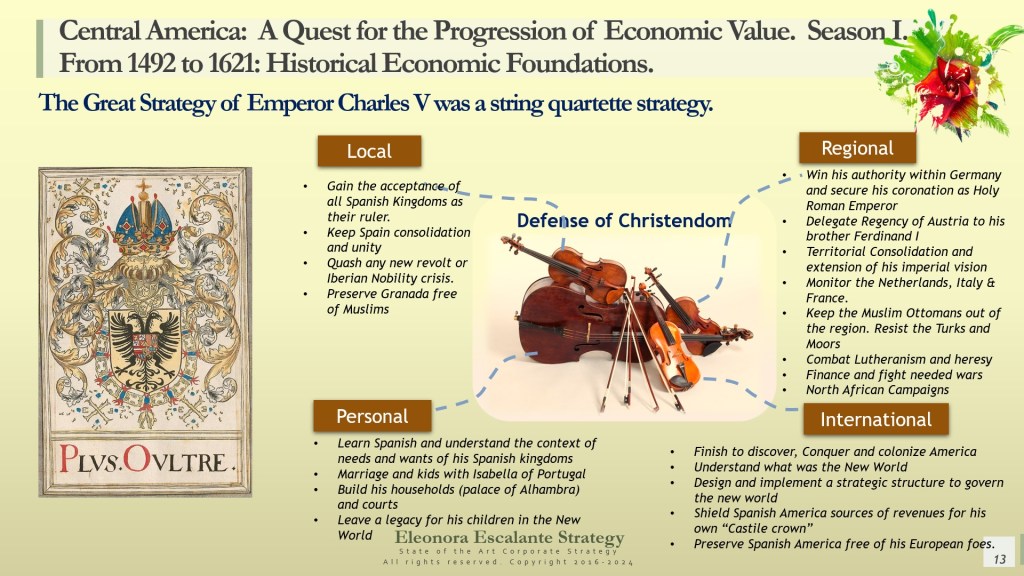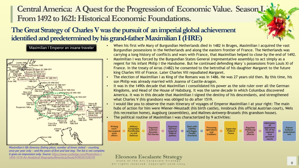 He had to build a household in every strategic place of importance after every land acquisition through war, to show that he was staying and that he was serious about remaining around regardless of his voyages. Nevertheless, he never stopped traveling, even with his coffin during the last years of his life. His voyages made him the top creator of strategic alliances between Central Europe and the Iberian Peninsula, and he was a Master on European affairs horizontal growth. What Maximilian lacked was the primitive capitalist system that could help him to eradicate his debts. Given the feudalist omnipresence of the epoch, his legacy to Charles V couldn´t help him overcome the burden of raising taxes, requesting special tributes and resources to boost all the money required for warfare. Maximilian was aware of the Lutheran Reform around the corner, and we perceive that he could envisage the superiority of the clashes coming from Germany against Charles V: The Knights Revolt (1522-3), the German Peasants War (1524-6), the sack to Rome after Pope Clement VII sided with France, etc. But Maximilian wasn´t knowledgeable enough of the schism degree of the Swiss Dutch German Protestantism, nor about the emergence of Lutheranism as a permanent alternative to Catholicism after the Schmalkaldic League in 1531. The first-born grandson Charles V’s corporate strategy decision-making was supposed to serve Spanish America, while Ferdinand I was supposed to protect the Habsburgs from the Hungarians and expand Austrian territories to Croatia, Bohemia, Moravia and Hungary. The European conflicts of Charles V delayed the A.E.I.O.U plans that Frederick III and Maximilian I carefully tried to weave. We wonder what happened with Charles V and his strategic route map with America´s conquistadors. How did he organize the conquest as of 1519? Was this his job as soon as his grandfather died? Or were their grandfathers Ferdinand of Aragon or Maximilian, the ones who organized how to command what happened later in Spanish America?