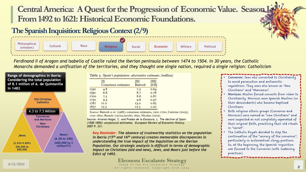 We randomly reviewed and analyzed several books about the Inquisition. There are considerable discrepancies in Spain’s population numbers before the arrival of the Catholic Monarchs. We understand it given the chaotic context of the Iberian rulers between the 8th and 15th centuries. During this period, the Iberian peninsula was inhabited by Muslims of different groupings, unfolding more than 700 hundred years of conflicts, wars, oppression, proscriptions of minorities, restrictions of careers or professions, and a clear dearth of a united vision for all the populations living in Hispania. This shattering situation affected the accountability and the responsibility of gathering good data.