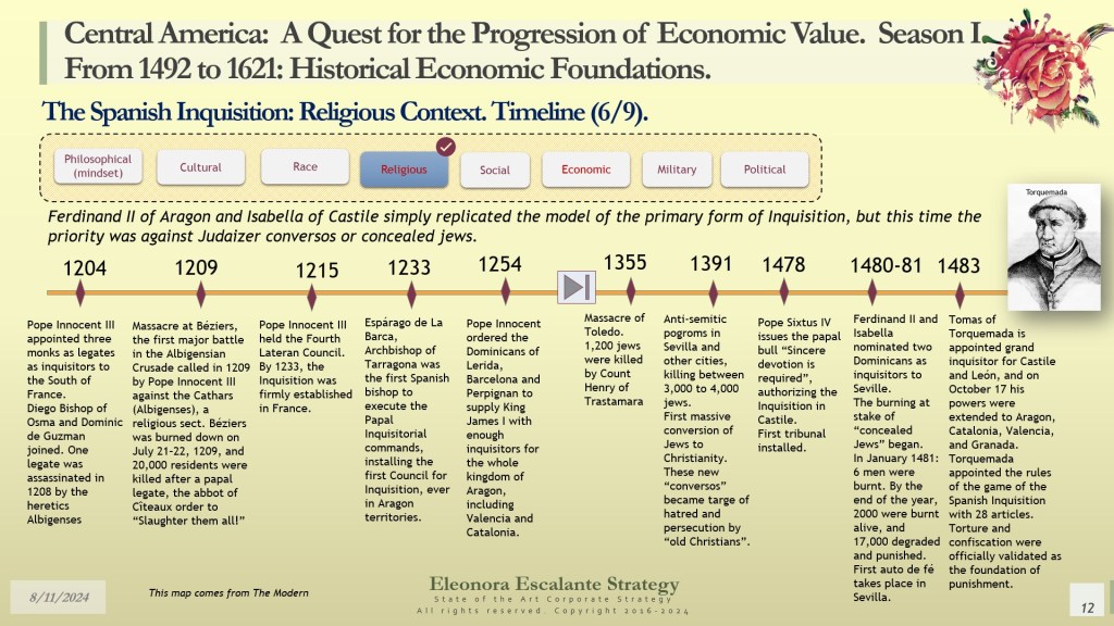 - Religious: Today´s publication includes slides 7 to 15 to explain in detail every crucial aspect of the Spanish Inquisition. The timeline of the inquisitorial procedures is described from the year 1204 to the year 1558. But do not forget that the Inquisition continued until 1834. We encourage you to read each of these slides which will provide a good overview of the religious context that Charles V had to carry during his life. We also have unlocked a hypothetical scenario in which Charles V Emperor took as a priority the conquest and discovery of America (slide 15).