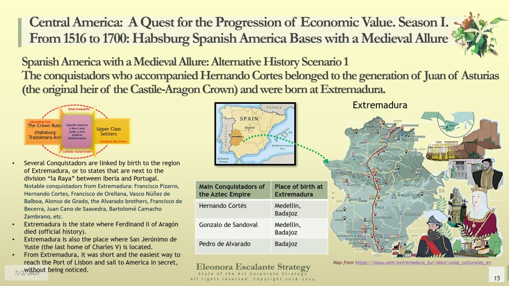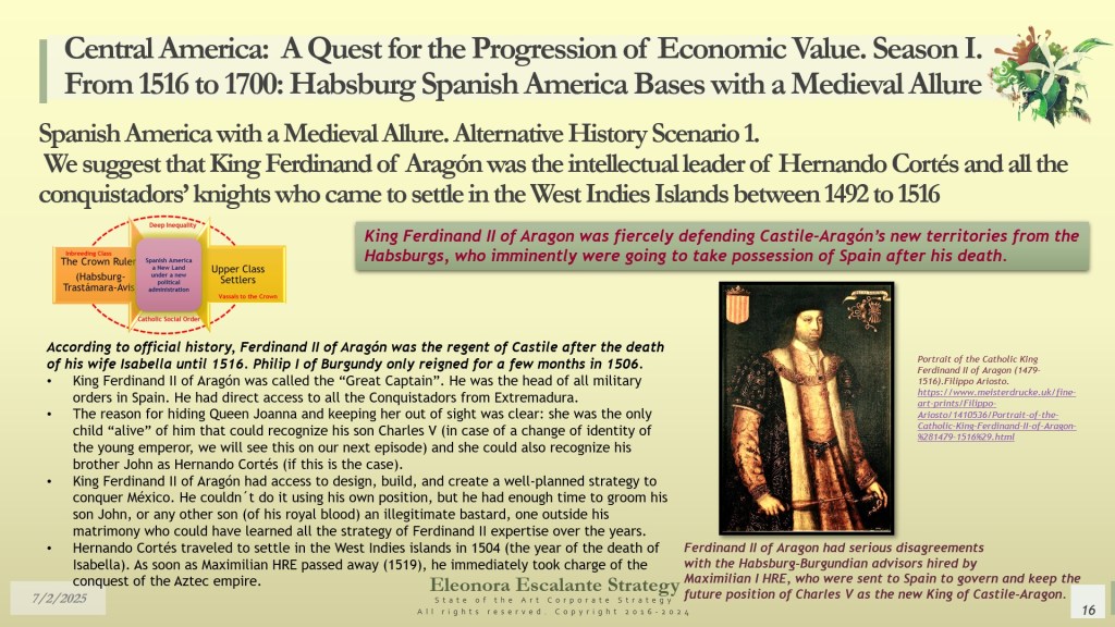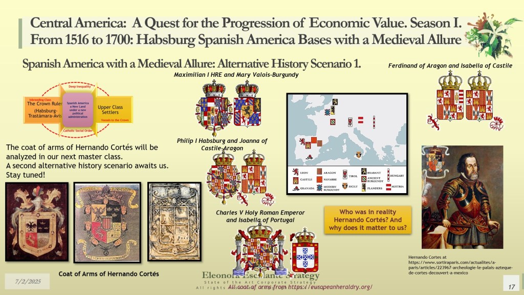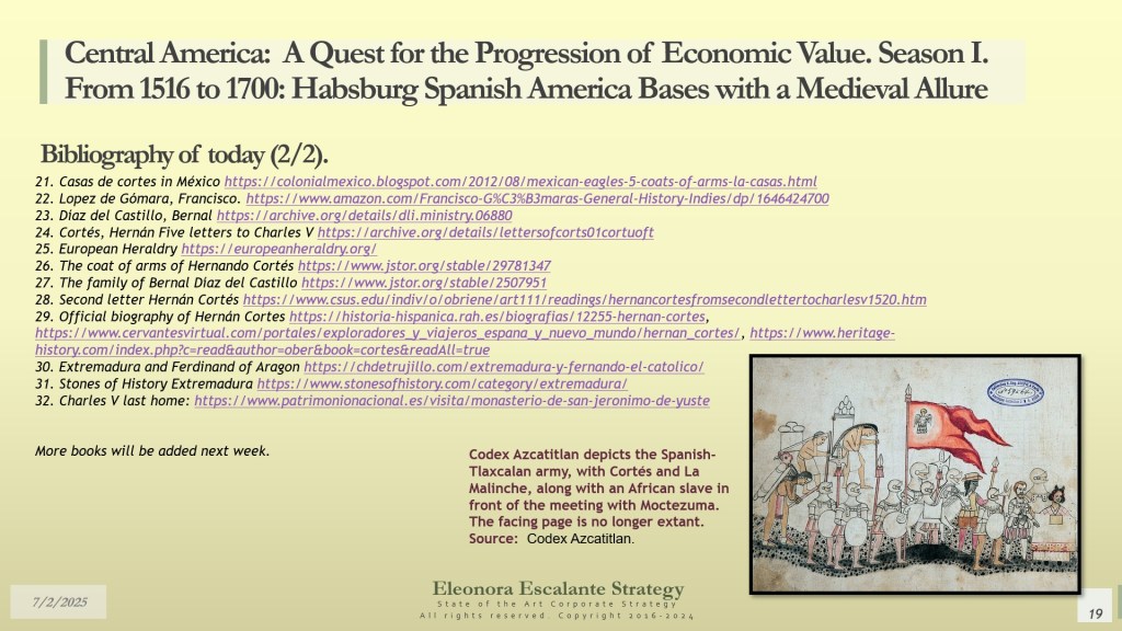 The conquest and colonization of Spanish America was the most intriguing priority not just for Spain, but for all the friends and rivals of Charles V. Colonizing a New continent wasn´t a common phenomenon. It was “the happening”, the most relevant experience of the 16th and 17th centuries. It is not the same to be conquered by a bunch of adventurers who were out of control of the commands of the Spanish rulers as to be colonized by members of the royal dynasties. There is a new sense of responsibility, a new sense of commitment, and a burden to be fixed, that requires immediate attention. It doesn’t matter if 525 years have passed. But how are the economists of today going to fix the poverty of Latin America? Particularly if we don’t know the truth. The vrai verité needs to be revealed into the light. Otherwise, what happens is that Central America is only changing from the hands of the Medieval past to a new digital begging technological system (that functions under the same medieval premises), in which the traditional handmade stuff gets virtual, but the roots of our problems remain untouched, as it was in the 16th century. Central America’s present “lack” of equitable economic development comes from the radical and brutal roots of inquisitorial conquest and the specific encomienda style of colonialism over the prehispanic populations. It was the medieval “modus operandi” of the Spanish kingdom of Castile and Aragón in Spanish America. The Catholic colonization (in many cases to protect the life of the survivors of Mesoamerican Indians) was performed in Spanish America. The Protestant Dutch, German, and British styles of colonization went to North America later. We will discover and discuss much more about these topics over the next episodes of Season 2.