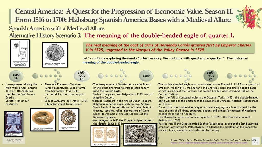 Our hypothesis is that Hernando Cortés wasn´t an adventurer soldier of Extremadura. He was the result of a swap identity strategy, in which this name was used by a member of a royal house with credentials to lead the conquest of México between 1519 and 1521. At the same time, the Spanish rulers were threatened by the expansion of the Muslim Infidels in Europe. When the Ottoman Empire conquered Constantinople in 1453, their growth continued to the East and the West. The Byzantium emperors and respective families were linked to the Holy Roman Empire of the German Nations, not just by dynastic marriages but also through the patriarchates of the Byzantine Orthodox church. The Pentarchy consisted of the union of 5 ancient patriarchates of the undivided Church of the first millennium after the capital of the Roman empire was transferred to Constantinople. These 5 powerful patriarchates were located in Constantinople, Jerusalem, Antioch, Rome, and Alexandria. The Crusades were a response to the needs and wants of the Patriarchates. In consequence, when the Ottoman Empire took the Byzantium territories, any order from the Pentarchy was a priority for the Holy Roman Empire of the German Nations. It is likely and viable that the Greek Imperial families of the Byzantium moved into Germany when the Habsburgs adopted the double-headed eagle as their main heraldic identifier. - The meaning of the double-headed eagle in quarter 1.