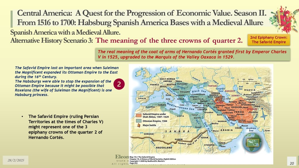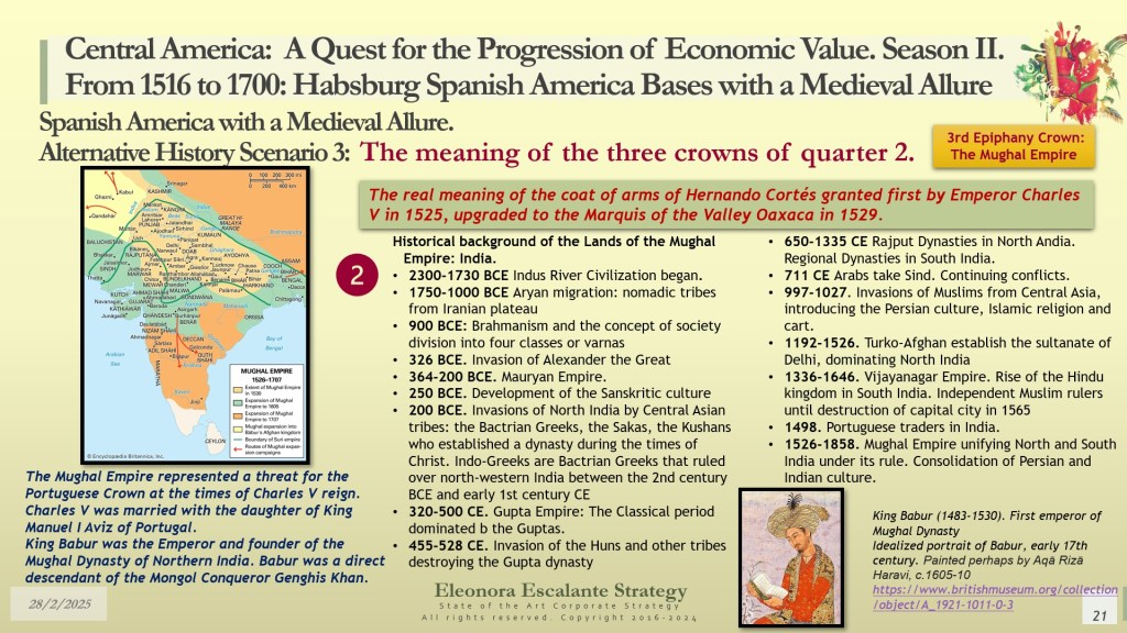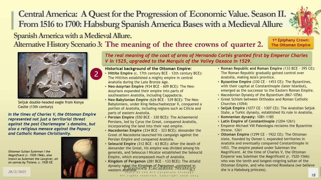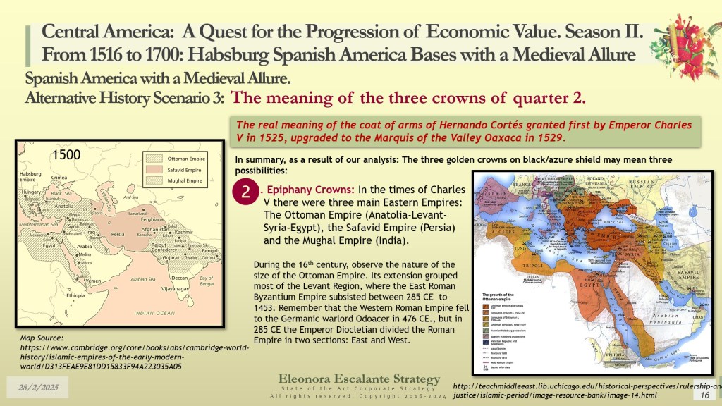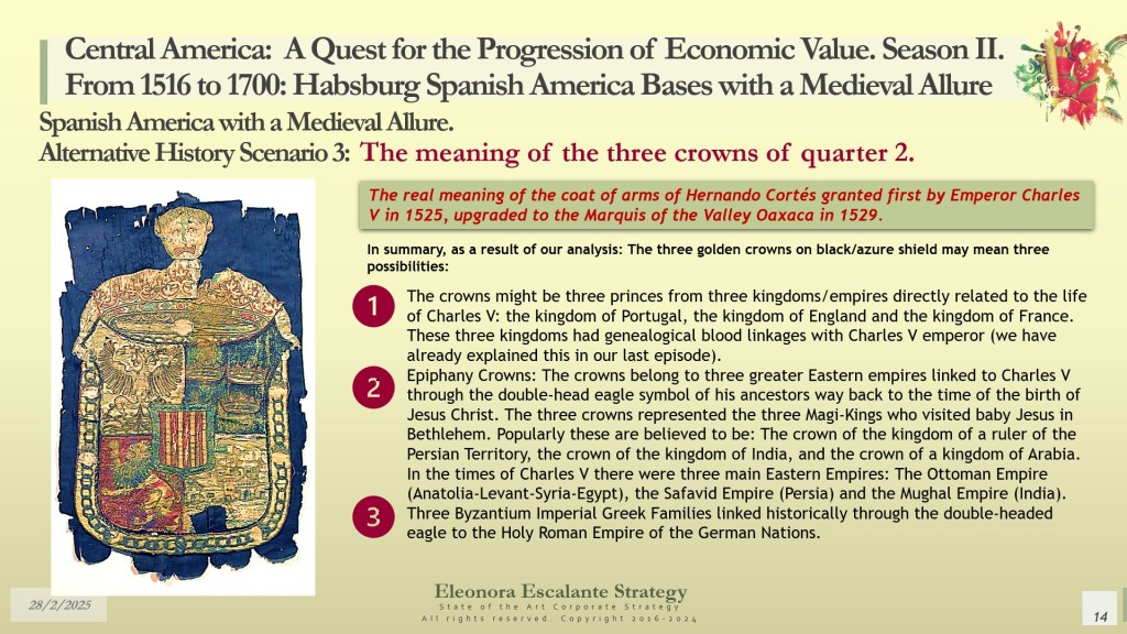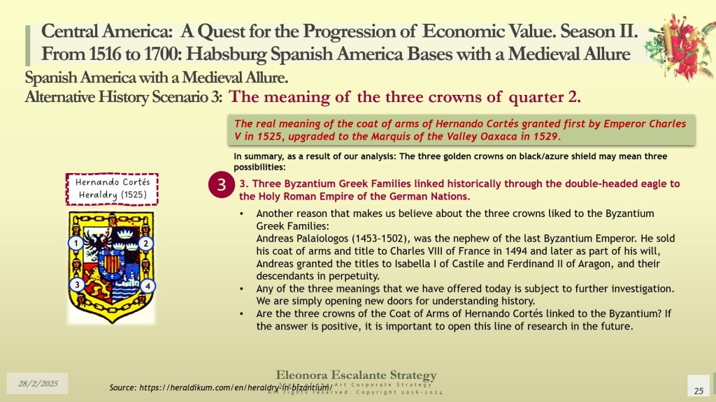 Slides 7 to 12 are dedicated completely to the symbol of the double-headed eagle. We explain with full details the origin of it (Hittites), how this was adopted by the different kingdoms of the region of Anatolia, Nicaea, Konya, and later by the Greek Imperial families of the Byzantium. We have shown you the distinct heraldic representations from 2500 BC to 1500 CE. In summary, this symbol was used by the different kingdoms associated with the region of what is now Turkey, Syria, Iran, Northern India, and the Levant. Then, it was wind down to Imperial Habsburgs and Russia through the Greek Paleologue, Komnene, and Vatatzes family. How did Hernando Cortés get in quarter 1 of his coat of arms, a double headed eagle too? Why on a silver field? This wasn´t a symbol of nobility; it was an Imperial heraldic achievement granted by Charles V Holy Roman Emperor, not as propaganda, but as an essential recognition of his own royal identity. Slide 12 shows our statement regarding quarter 1. - The mean of the three crowns of quarter 2.
