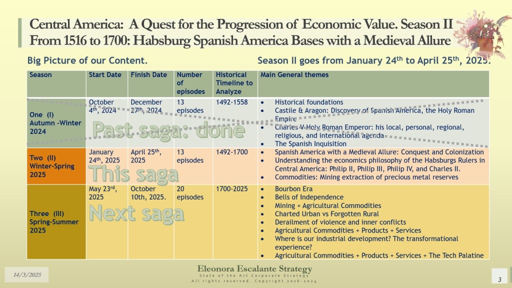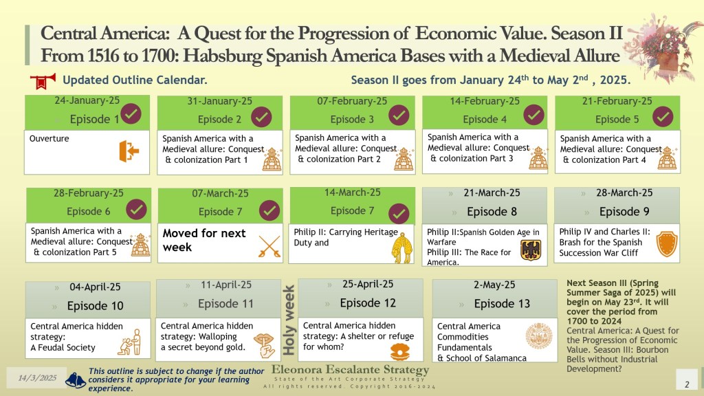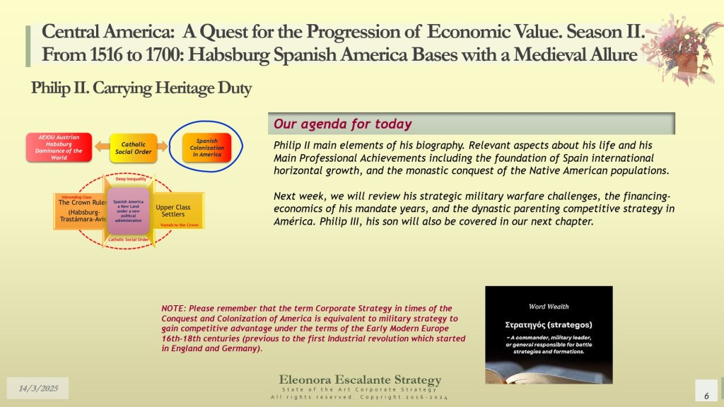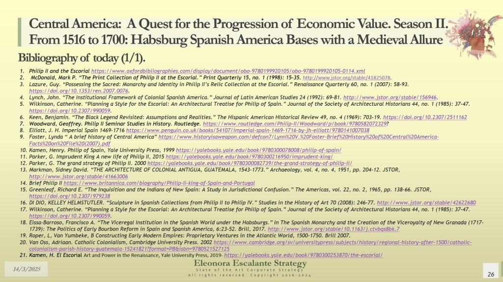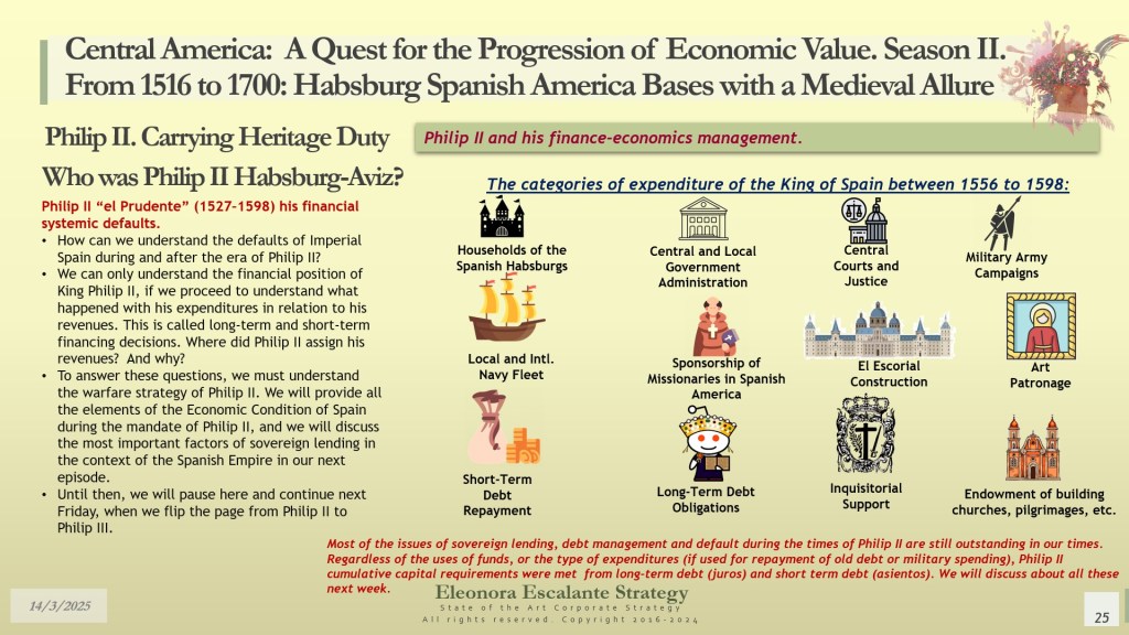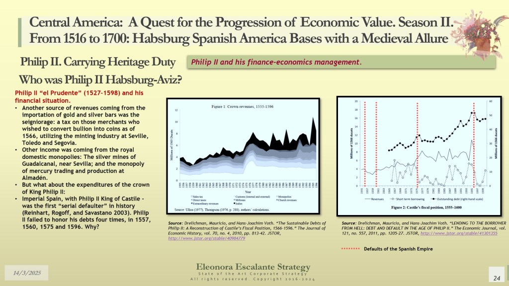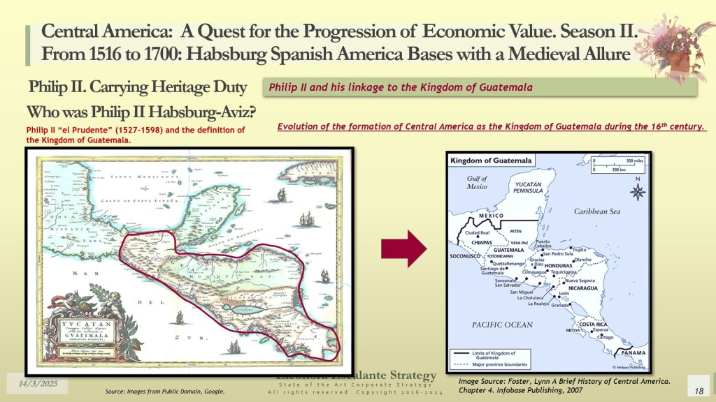 Next week, we will continue exploring the financial situation of Philip II of Spain according to his grand strategy of warfare. The reign of Philip III as a king was short, and it will be included in our next chapter; in consequence, we are well on track with our outline calendar. Please do not lose sight of the fact that we are comprehending the corporate strategy of the Spanish Habsburgs from 1519 to 1700 in our quest to understand the economic foundations of the Kingdom of Guatemala, the lands that later were called the United Provinces of Central America.