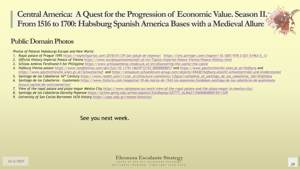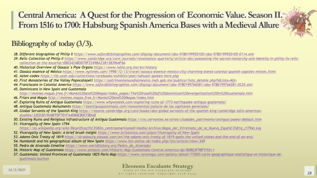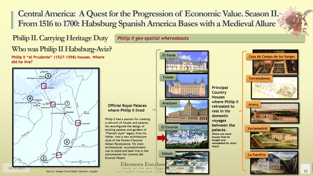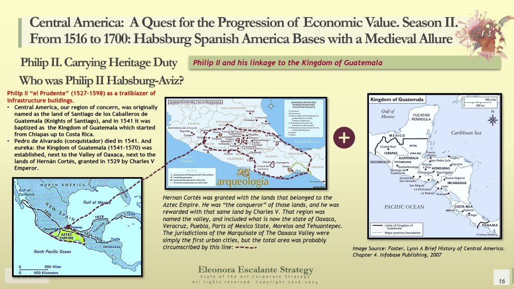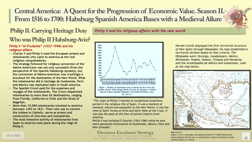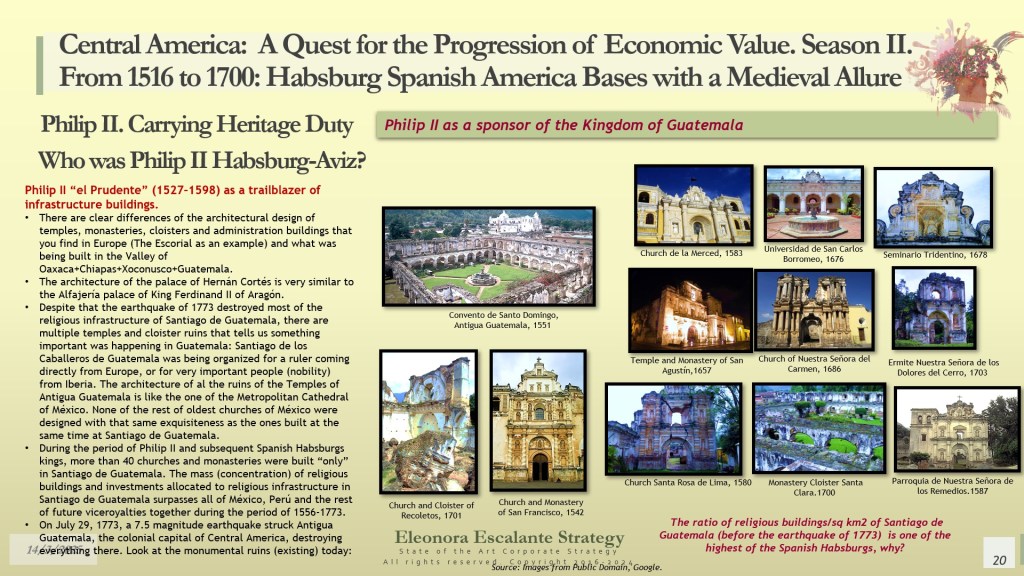 - Philip II’s reign left enough evidence of infrastructure buildings in the New World. His sponsorship of the Catholic missions was relevant enough everywhere. But in Guatemala, there was a special mission doing something extremely important after the arrival of Francisco Marroquin. The beauty and majesty of the Catholic temples and monasteries built in Santiago de los Caballeros (Antigua Guatemala) has no competition with any other network of Catholic temples in México or Perú. The ratio of religious buildings per sq km is higher there than anywhere else in the new continent (ratio measured as construction investments between 1542 to 1700). The place of worship of Santiago de Guatemala was being prepared for the royal Habsburgs, with the occasion of safeguarding this place for their future. This is our best-anticipated bet, and we will demonstrate it by the end of Season II. Other Habsburg lines prepared the path for further hubs in South America as of the 18th century too. Read slides 16 to 20.