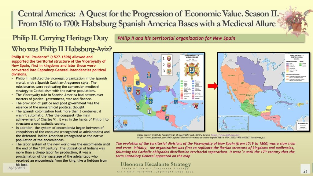 - It was under Philip II’s ruling time, that the territorial organization of Spanish America took place. It was a Castilian-Italian political division. See slide 21, please. We reflect on the role of Italian infusion practical modus operandi because most of the clergy commitments in New Spain and the Kingdom of Guatemala answered to the Papacy, which was in Rome. The crown of Spain paid for them to come to convert Indians, but they had a double line of reporting: the Papacy in Rome and the Spanish Government. The real conquistadores of the Indian communities were the Church priests and missionaries. Their enthusiastic mandate to convert the Natives to Catholicism saved the Indians from being inquisitorially fired in “autos de fé”, but the Church couldn´t protect them from the encomiendas, the diseases, and the long-term low-wage slavery exercised by the Spaniards since then. See slide 22, please. Our strategic house is convinced that if Charles V hadn´t sent the Franciscans, the Augustinos, the Dominicans, the Mercedarians, and later the Jesuits, the Convent of the Descalzas Reales to México and the Kingdom of Guatemala, there wouldn´t be one single Aztec or Mayan alive to our days.